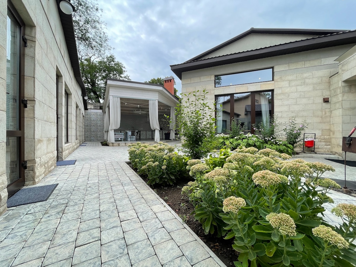 Этот дом идеально подходит для семьи или для компании из 6 человек. В доме на 2-х этажах расположены 3 спальни, уютная гостиная с камином и большая, светлая кухня, которая создана для самых эстетичных завтраков за круглым столом. Свой двор и зеленый уголок с зоной для вечернего бокала вина или утренней чашки кофе. Есть место для парковки автомобиля. А также, гости в отведенное время, могут насладиться зеленым садом хозяев дома.