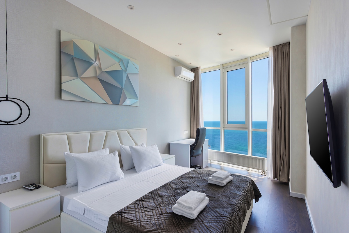 Premium class designer apartment in Arcadia with a sea view! Finished with luxury materials, Italian furniture and a kitchen that has everything from a full set of cookware to a dishwasher, oven and coffee maker, and of course coffee for guests. A huge sleeping bed and a folding chair-bed for a child or guest, dressing room, high-speed WI-FI, keyless access, large plasma TVs, air conditioning, parking, security, video intercom, bar area on the balcony. And love for guests! :)