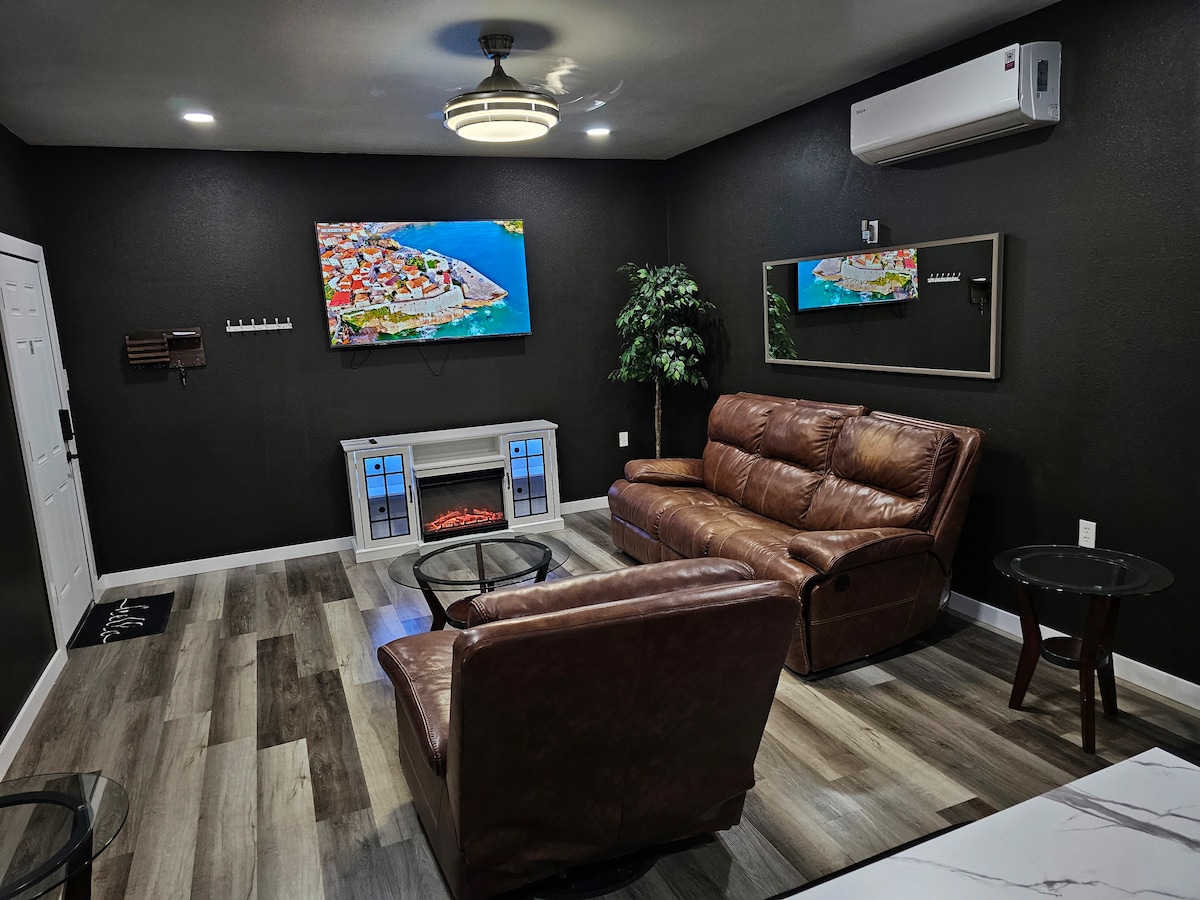 Centrally located near various restaurants & shopping, all short distance away. Spacious 1BR 1 bath with open floor plan for kitchen/dinning/living room. Our unit offers free Wi-Fi, keyless entry, and full kitchen. Fresh linens, towels, iron/ironing board, and washer/dryer can be found in spacious closet. Bedroom has Queen bed, desk, and each room has Amazon Fire smart TV w/ remote to access multiple streaming apps A small patio is located off living area, with seating and space for pets.
