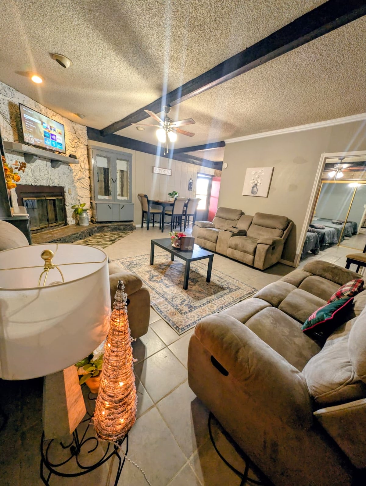 Relax with the whole family at this peaceful home away from home. KING master suite has doors to patio and front queen bedroom has its own cozy outdoor nook each with its own tv. Indoor fireplace and patio off the kitchen. Third queen room and 2 full baths.