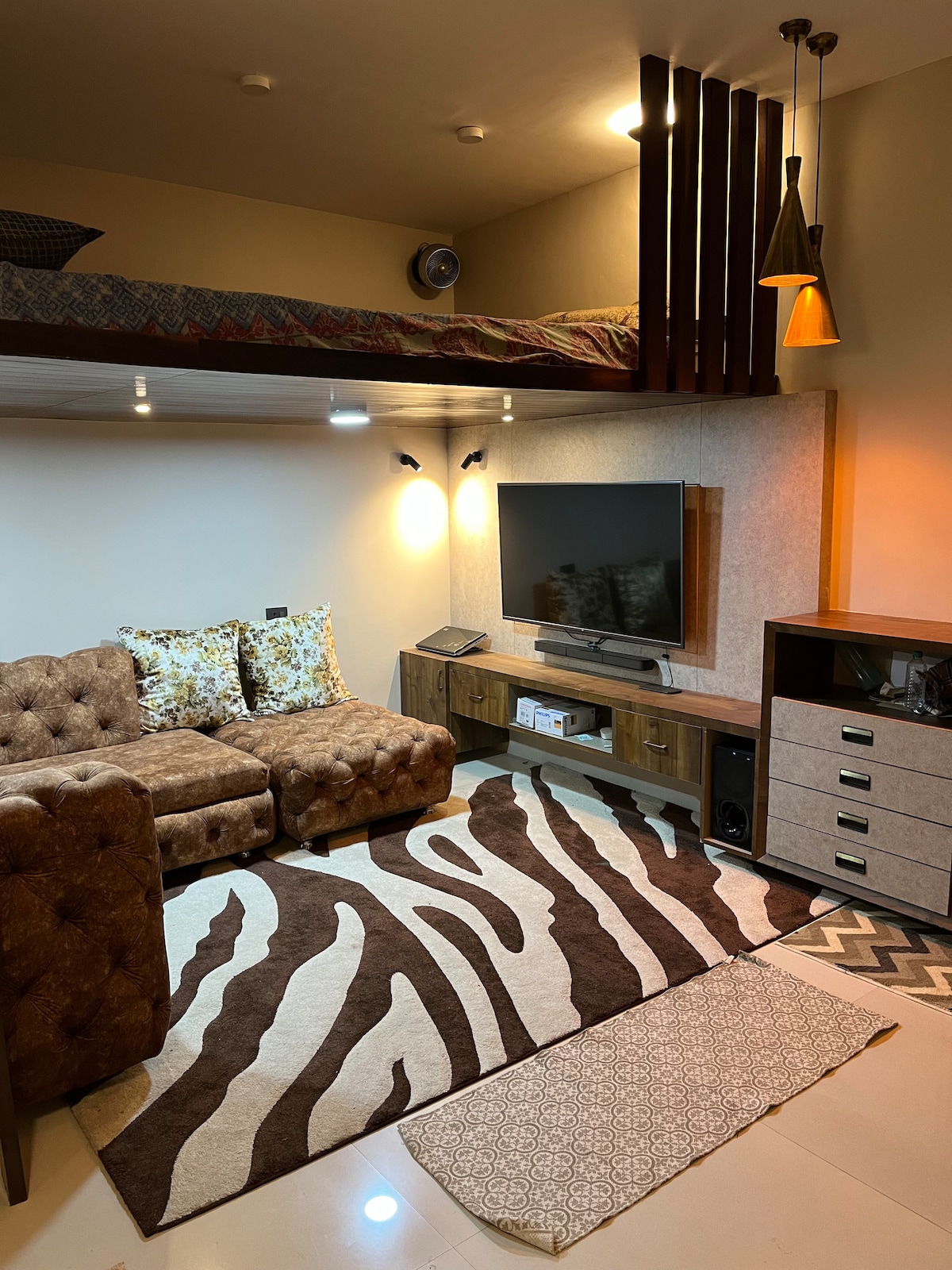 "Formula House" (FH) is an unique dwelling embodying the new design philosophy of "CIRCA" (Contemporary Indigenous Resilient Civilisational Architecture). It includes multiple green building principles (Solar PV, rain-water conservation, energy-efficient appliances etc.). The listing is for the 1st Floor. It provides a serene contemplative space that seamlessly blends ultra-modern luxury with timeless-heritage in terms of furniture, appliances, exhibits, and a curated Telugu & English library.