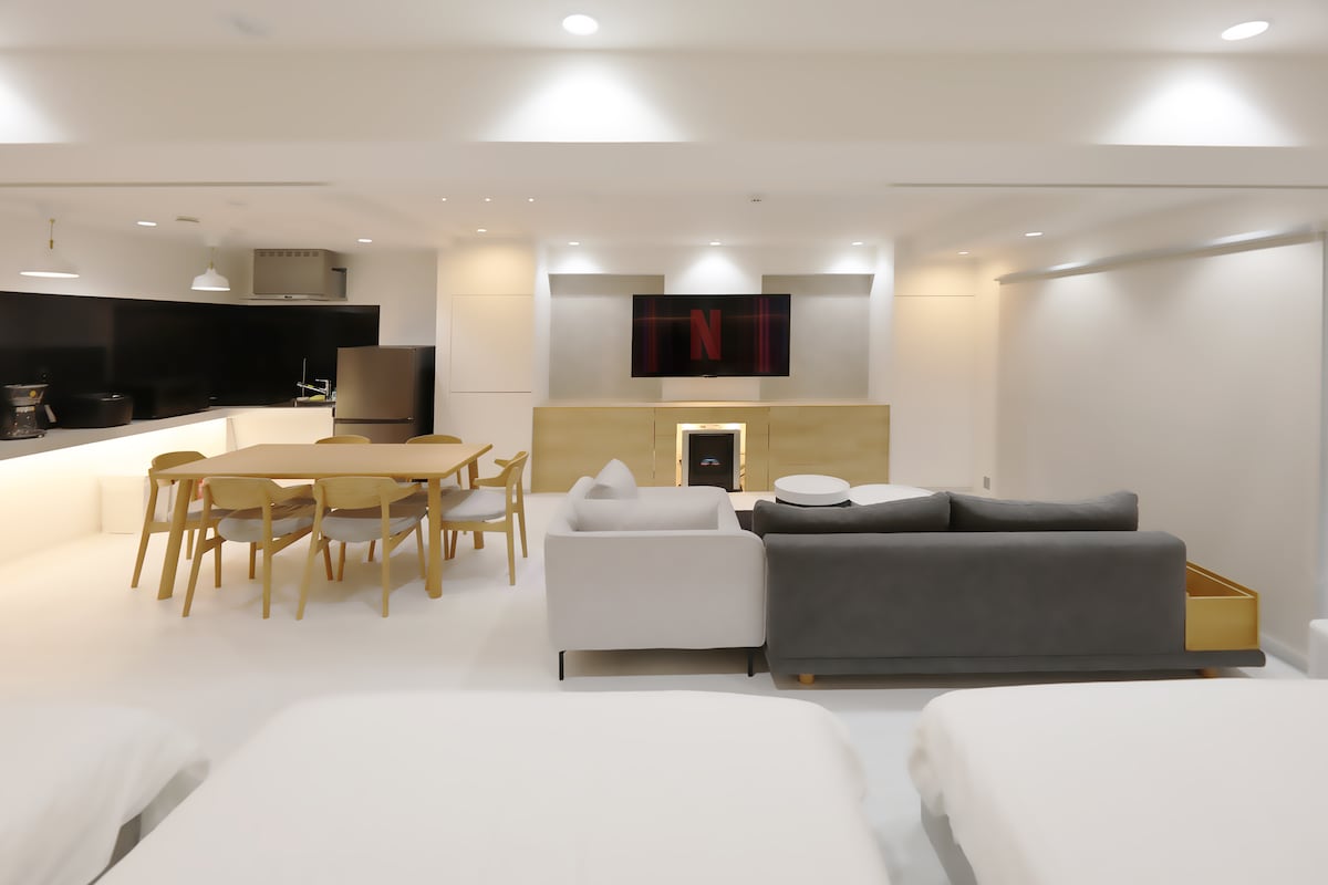 这是一间位于札幌地区的 2LDK、51㎡ 宽敞房间。设有三张双人床,可容纳最多 6 位入住,无论是家庭出游还是朋友结伴都能舒适休息。室内以灰色为主调的单色风格,搭配黑色和棕色家具,呈现出干净且低调的高级质感。利用挑高天花板的照明设计与圆形餐桌,营造出让大家自然聚在一起的温馨客厅。配备带浴缸的浴室、独立洗漱台、带烘干功能的洗衣机、全套厨房设备等,完善的设施也非常适合长期入住。旅行的疲惫可在此慢慢放松,仿佛回到自己的家一般自在。 地理位置便捷,前往札幌市中心及主要观光景点都十分方便,是札幌观光的绝佳据点。在这处结合北海道自然与札幌都市便利的高品质疗愈空间中,尽情享受札幌的魅力,度过难忘的旅程。