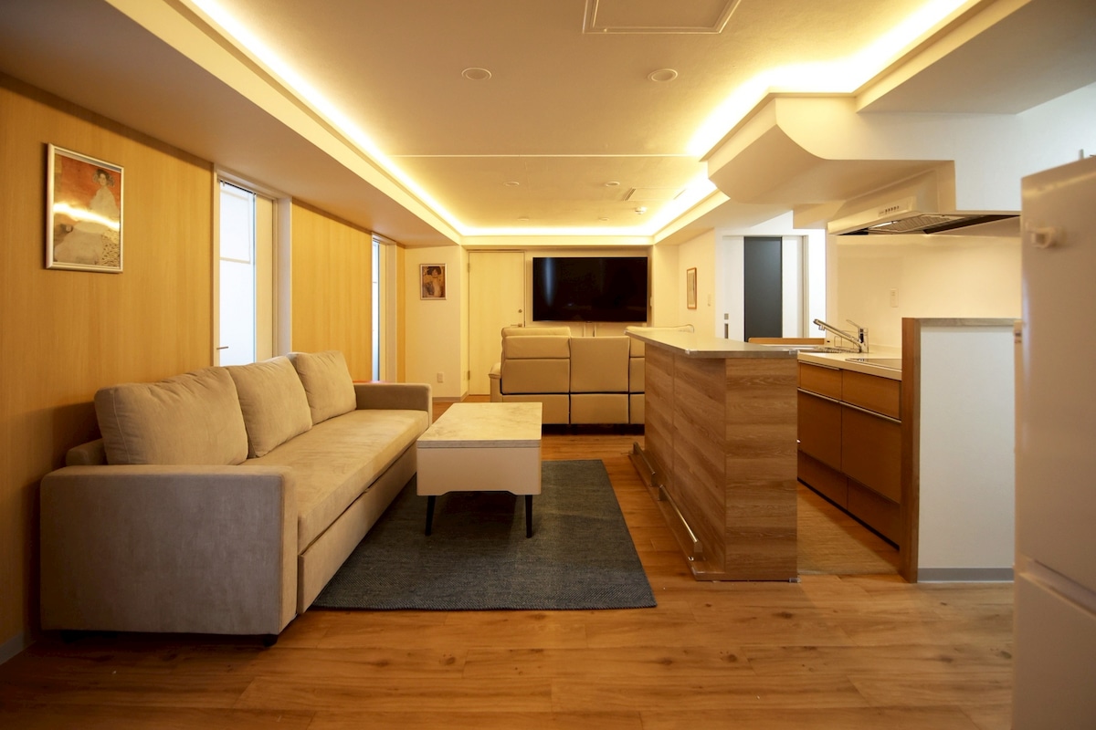 Bright, comfortable 4LDK + service room—ideal for business, remote work, and longer stays. Spacious living room with open kitchen counter and cozy indirect lighting. ~5 min walk to Kanjo-dori Higashi; 6 min to Sapporo, 8 min to Odori, 10 min to Susukino by train. Fast Wi-Fi, large TV with streaming (on-site setup). Kitchen: IH, microwave, rice cooker, hot water dispenser, coffee machine (supplies vary). Paid parking by reservation.