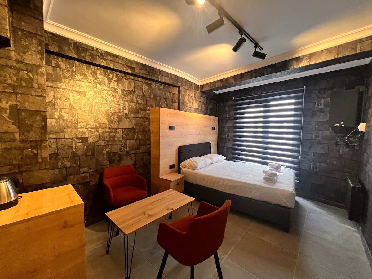Hello, from a wonderfully restored mansion in the city center! Located in a quiet street close to a lively arts scene and shops for all tastes, Yuva Otel is right next to the most important pedestrian axis of the city and the old town. The rooms impress with their comfort and design. In summer, you can enjoy the sun with the scent of mint plants in the terrace restaurant. This room is located on the ground floor. For the 1st floor, you can take a look at the other rooms in our profile.