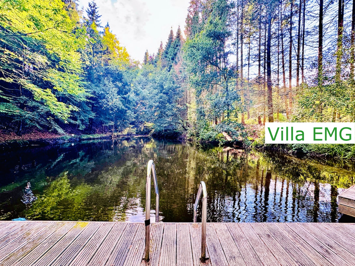 Your private forest begins at the door - 2.5 hectares of woodland, a still lake and a dock that's yours alone. Perfect for groups up to 22: retreats, family gatherings or simply reconnecting together. 350 m² half-timbered villa · 7 bedrooms · sauna · jacuzzi (seasonal) · BBQ patio · parking for 5 cars. Quietly remote, yet within 30–40 min of Bad Oeynhausen, Osnabrück and Bielefeld/Minden.