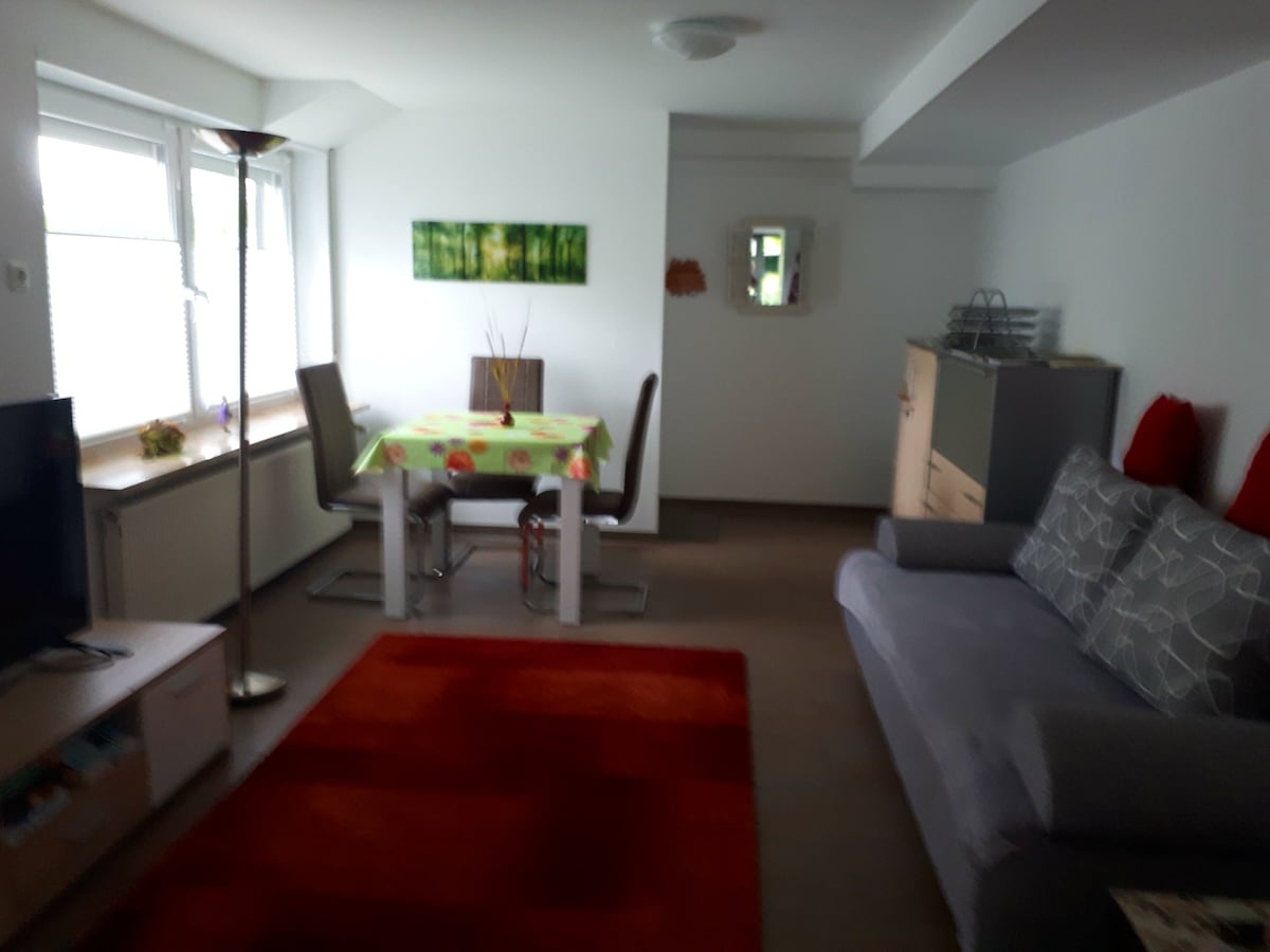 Voll ausgestattetes, 2025 frisch saniertes Appartement im Untergeschoss unseres selbstgenutzten Hauses. Der separate, stufenlose Eingang mit Rampe sorgt für einen bequemen und unabhängigen Zugang. Ausstattung Eigenes Bad Praktische Kochnische mit 2-Platten-Induktionskochfeld, Kühlschrank mit Eisfach, Spüle & Küchenutensilien Großer 50" Smart-TV mit Netflix & Amazon Prime Doppelbett (140 cm) Esstisch mit zwei Stühlen.