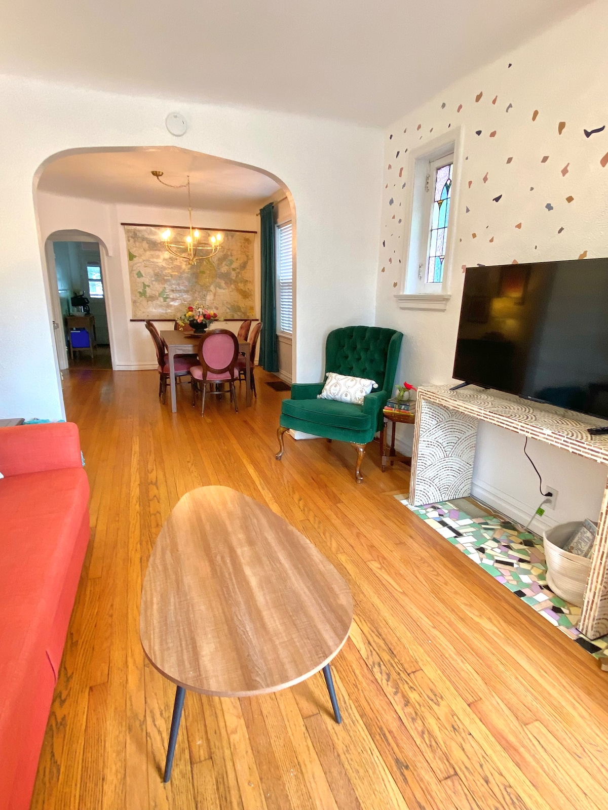 A true gem only a 15 min drive from the STL Airport. Enjoy a well equipped, century home a short 12 min walk to Historic Main and a HOTTUB. The large stocked kitchen is great for entertaining. Master bedroom w/luxurious, king sized, 4 poster bed and ensuite bathroom awaits you. In the private, queen suite you’ll find its own bathroom and another door leading onto the deck. The chair off the kitchen folds out to a standard twin and bedding is provided for the sofa as well. Can sleep 6.