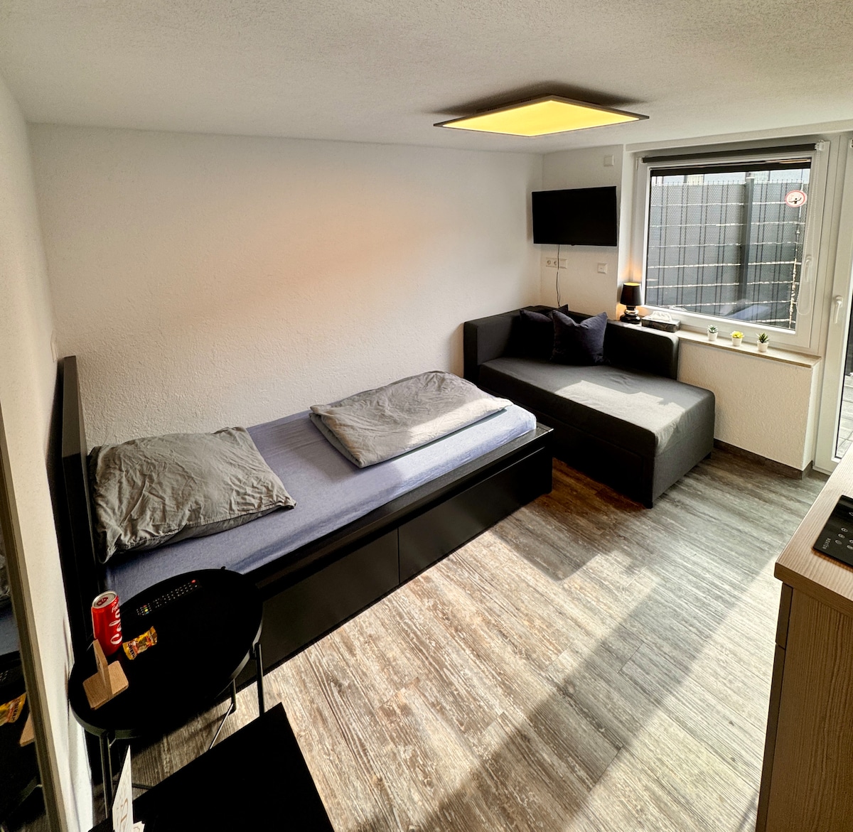 möbliertes 1-Zimmer-Dachgeschoss-Apartment in einem 3 Familienhaus kontaktloser und einfacher Check-In und Check-Out bietet Ihnen zudem vollste Flexibilität und Zugang zu Ihrem Apartment • Küche (mit Kochfeld, Kühl- und Gefrierschrank, Kapsel-Kaffeemaschine, Wasserkocher, Toaster,usw) • komfortables Bett für 2 Personen und Sofa mit Smart-TV • Home-Office mit Arbeitsplatz • kostenfreies Highspeed Wifi • Bad • Bartisch + 2 Barhocker • Sessel mit Hocker öffentliche Parkplätze im Wohngebiet