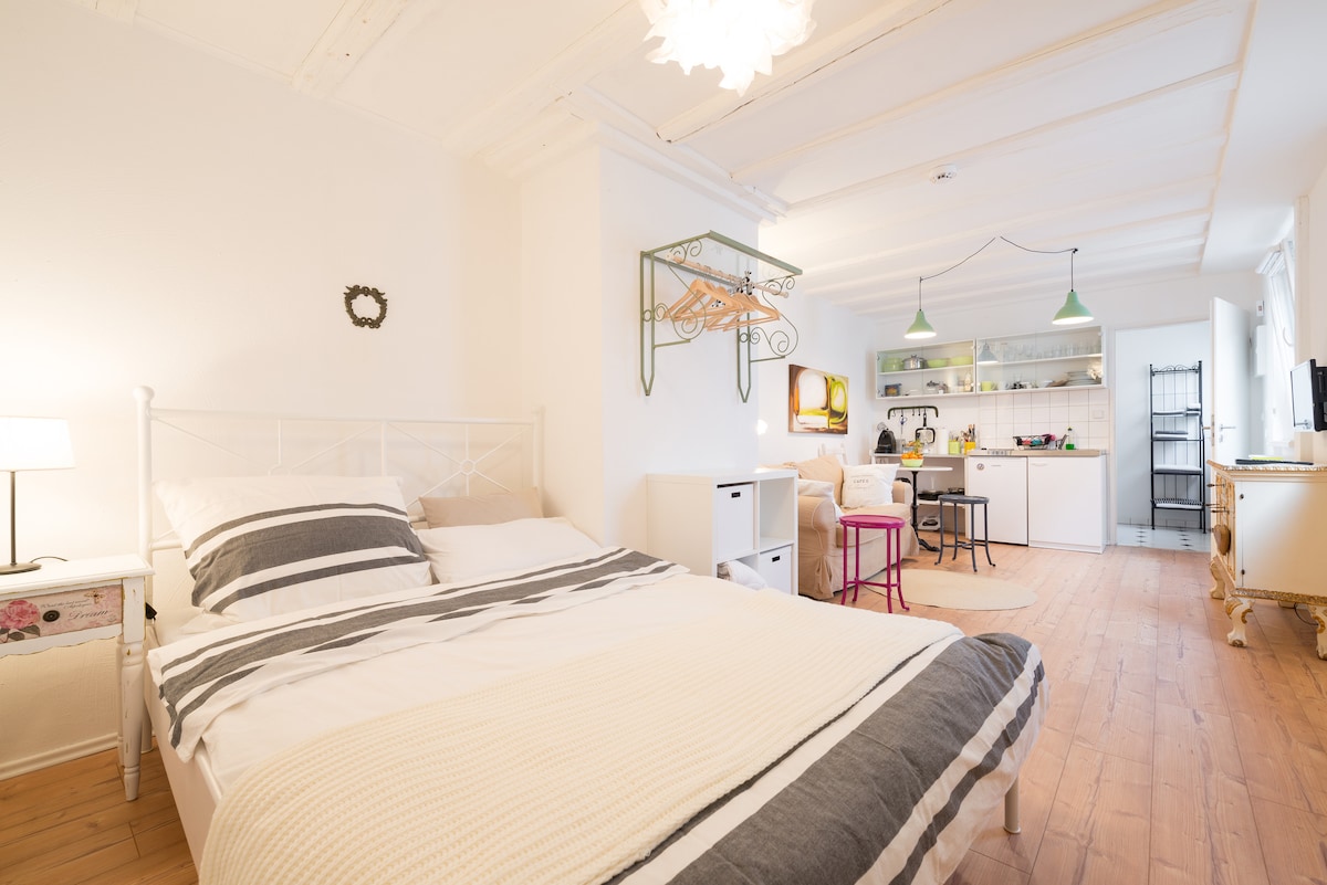 Klein, aber zentral. Und alles drin. Eigener Eingang. Gemütlich, praktisch, sauber. Kuschelig, auch für zwei oder mehr Personen ein feines Zuhause auf Zeit. Wir lieben Gäste. Also sorgen wir dafür, dass du dich wohl fühlst. Und wir reisen selbst gerne. Es ist doch ärgerlich, wenn man für ein paar Tage erst noch Spülmittel kaufen muss, oder. Deswegen ist alles da, auch die Küchenrolle, Zucker und Salz. Weniger ist manchmal mehr: hier bist du mittendrin.