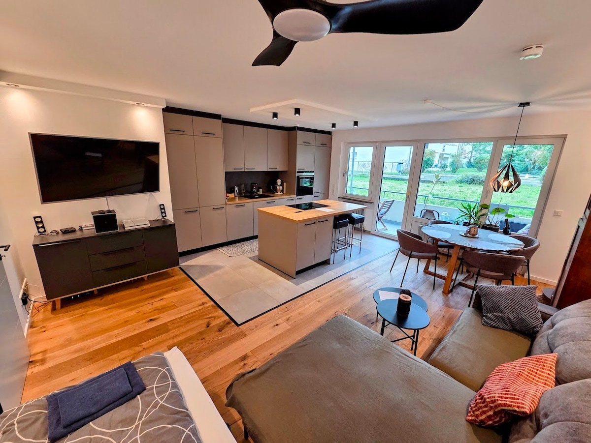 Welcome to our stylish and spacious penthouse in the heart of the Rhine-Main area! Only 12 minutes by public transport to Frankfurt city center. Perfect for families, the accommodation offers 3 bedrooms, 2 bathrooms, a large living room, a fully equipped kitchen and office. Enjoy the sunny roof terrace, 2 balconies, WiFi, Netflix, fully automatic coffee machine with coffee beans, free underground parking and convenient elevator access. Ideal for up to 6 people!
