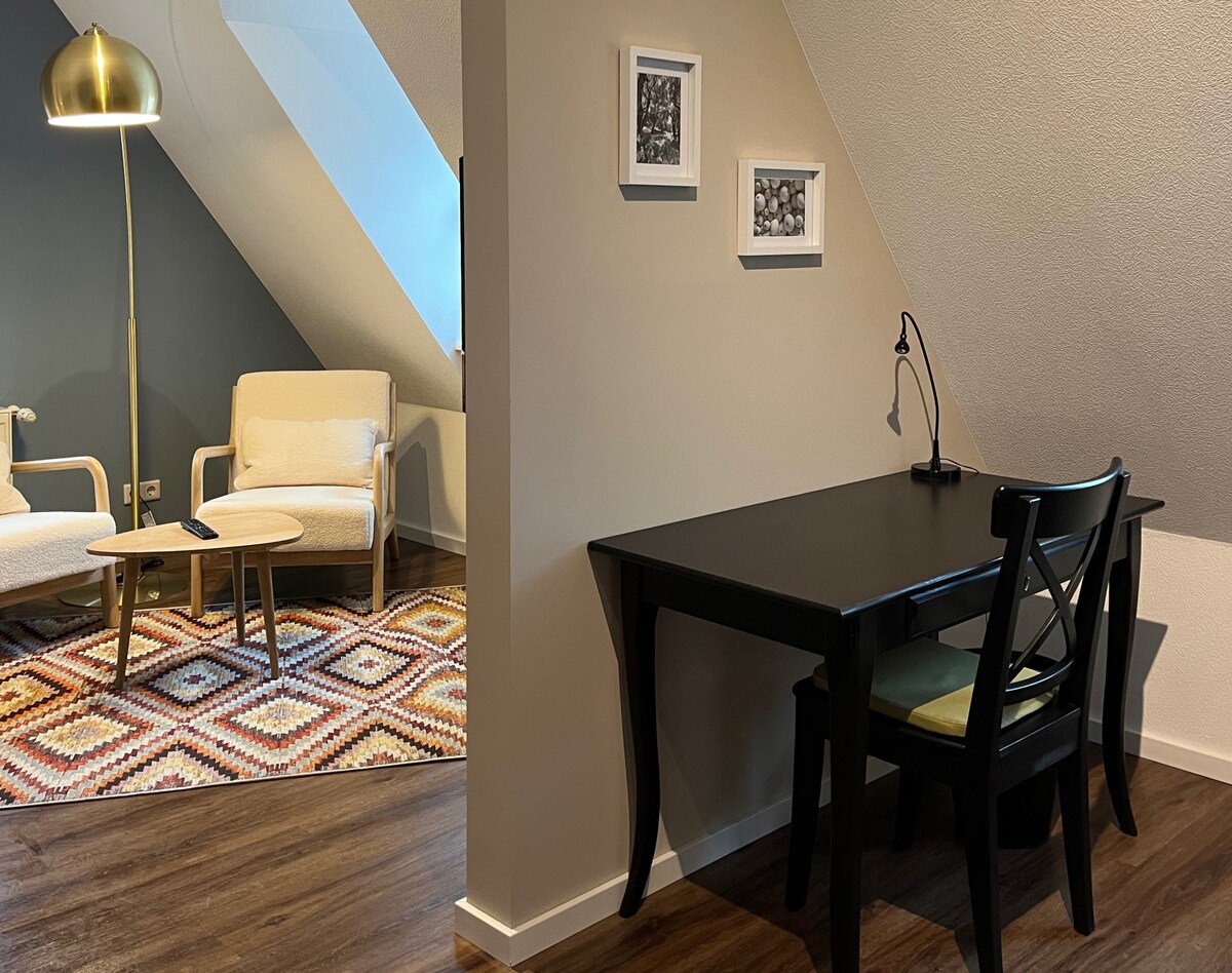 Unsere moderne und gemütliche Privatwohnung im Dachgeschoss eines Zweifamilienhauses lässt keine Wünsche offen :) Die offene und lichtdurchflutete Studiowohnung (68m²) im Dachgeschoss umfasst Wohnbereich mit Smart TV, ein großes Bad mit Badewanne und Dusche, Schlafbereich mit Doppelbett, Kleiderschrank, Kommode und Kleiderständer sowie eine offene Küche. Das WLAN ist natürlich inbegriffen. Auch für "Langzeitmieter" ideal :)