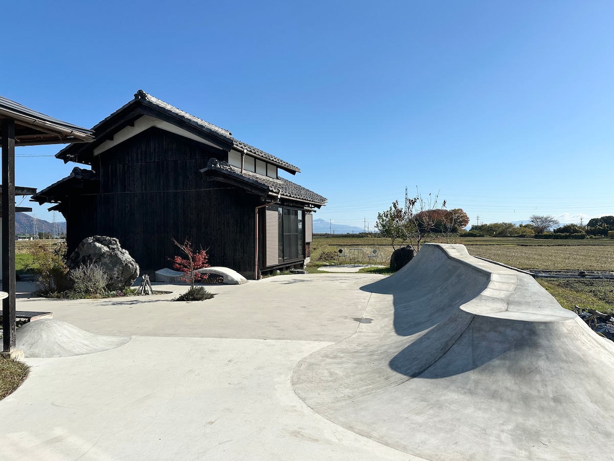 田畑に囲まれた日本家屋 庭には滑れるランドスケープのような小さなスケートパークがあります ここは泊まれる喫茶のような場所 何かを消費するための滞在ではなく、 少し立ち止まり、呼吸を整え、 自分の感覚を取り戻す その為のゆったりとした時間を過ごす場所 建物は古い日本家屋を オーナーである日本画家が少しずつ改修しています 壁を塗り、床を整え、庭をつくり、 今もゆっくり変化し続けています 庭には小さなDIYスケートパーク 駐車場でもあり、庭でもあり、 山や水の流れのような曲面を持つ地形 アールの上からは琵琶湖の湖面が望め、 竹生島や伊吹山、箱館山も望めます アメリカから来たスケート文化を 日本の田園風景に合う形に 置き直しました 滑る人も、眺める人も、 ただ座っているだけでもいい場所 聞こえるのは 鳥やカエルや鈴虫の声、風、田んぼの水の音 夜は星と月がよく見えます 便利さや過剰なサービスはありませんが、 この土地の時間をゆっくりとお過ごしください 都会から来る人ほど 長く滞在してくれます この風土を感じる為に 2泊以上がおすすめです