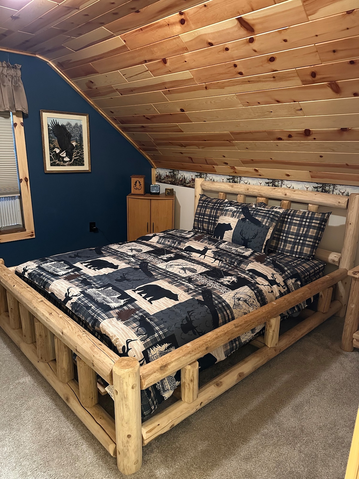 Welcome to West Lodge! A beautiful cabin at the end of a quiet dead-end seasonal road. Sits on 70 acres with beautiful countryside views and 2 large decks. All the amenities of home, including TV, WI-FI and a basement with 80” TV, ping pong table, and 2 bonus twin beds. Main area upstairs consists of 2 king rooms, 1 queen room, 1 queen bunk room and 2 full baths. Near several golf courses and close to thousands of acres of state land and trails - perfect for golfers, ATV riders and hunters