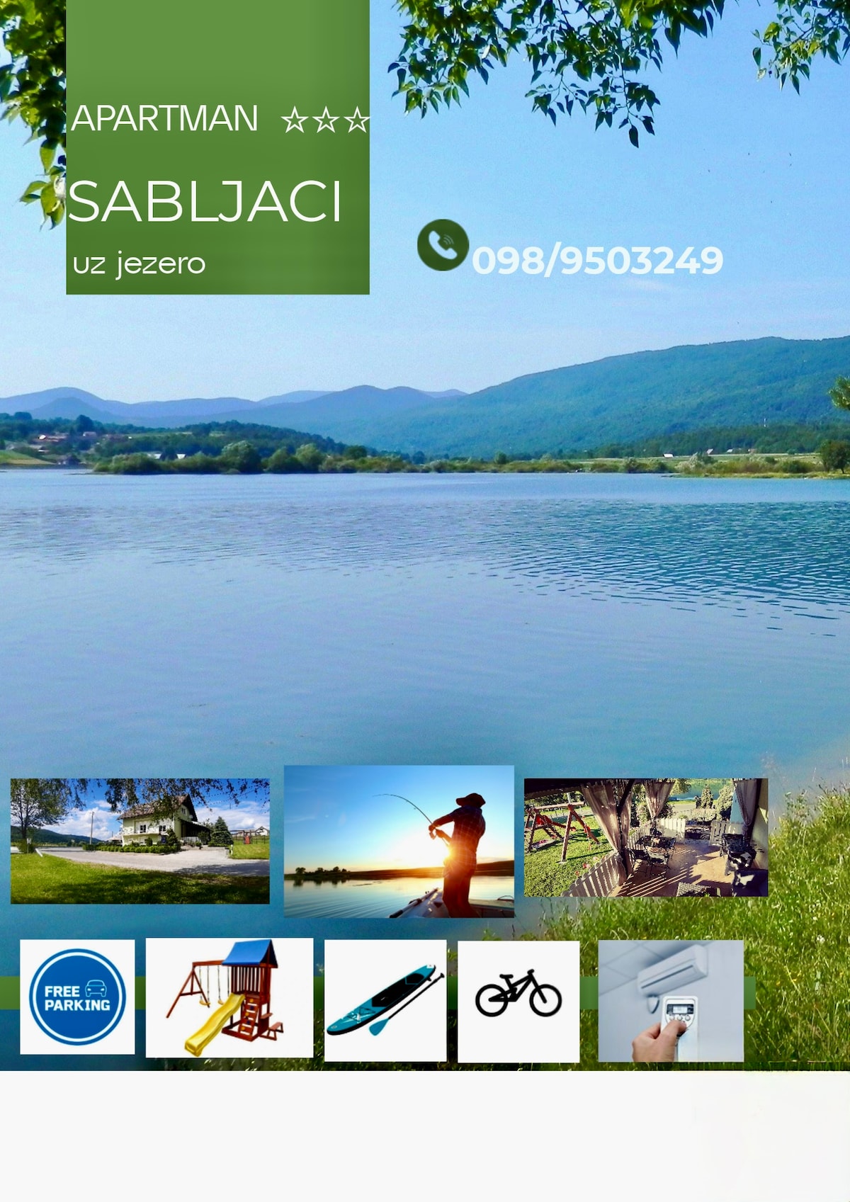 Apartman se nalazi se uz obalu jezera iz kojeg se kroz velike ostakljene stijene pruža pogled na samo jezero i okolna gorja. Idealan je za opuštanje i bijeg od gradske vreve. Parovi mogu uživati u intimnosti smještaja, a zbog kapaciteta od 5 odraslih osoba moguća su i ugodna obiteljska okupljanja. Ljeti se može kupati u jezeru i uživati na vanjskoj terasi, dok zima nudi smještaj u toplini unutarnjeg kamina. Grijanje je automatizirano na pelet, dok si za dodatan ugođaj možete korisiti kamin.