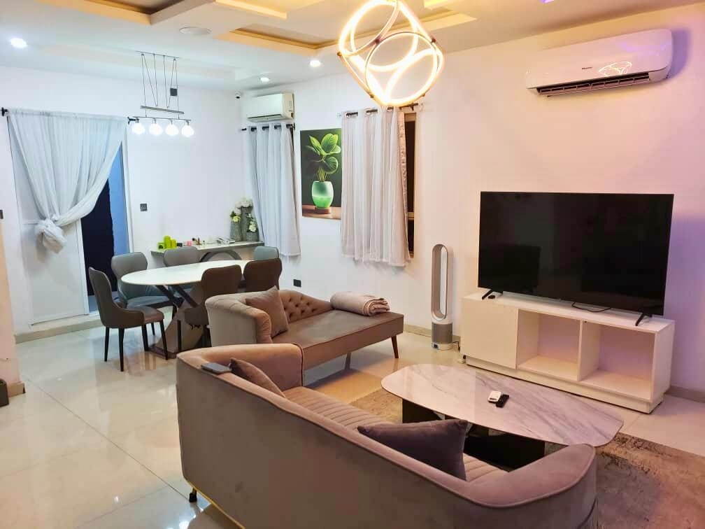 You're welcome to our apartment, located in a gated estate with restricted access to the general public. We offer 24rs electricity and air conditioning of your apartment. It is a tasty, Homely & Family-themed 2-Bedroom Apartment with a Balcony. It's the perfect place for a family vacation & weekend getaway, bridal showers, marriage proposal etc. We have the following: 24hrs Electricity 24hrs Air Conditioning 24hrs hot water Clean Water Starlink Wi-Fi Errand services