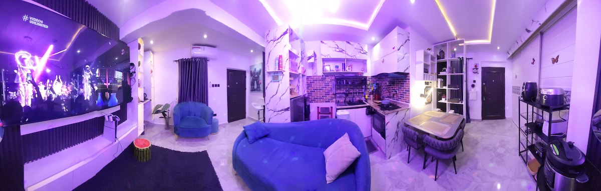Welcome to our cozy studio apartment, located in the vibrant heart of Lekki Phase 1! Perfect for solo travelers or couples, it comes with breakfast for 1 guest every morning. The space is thoughtfully designed with a cozy sleeping area, a fully equipped kitchenette and a clean, spacious bathroom. Situated in a secure neighborhood, We have a lounge, an hypermart, restaurants in the premises, the gym and beach is just few minutes away.