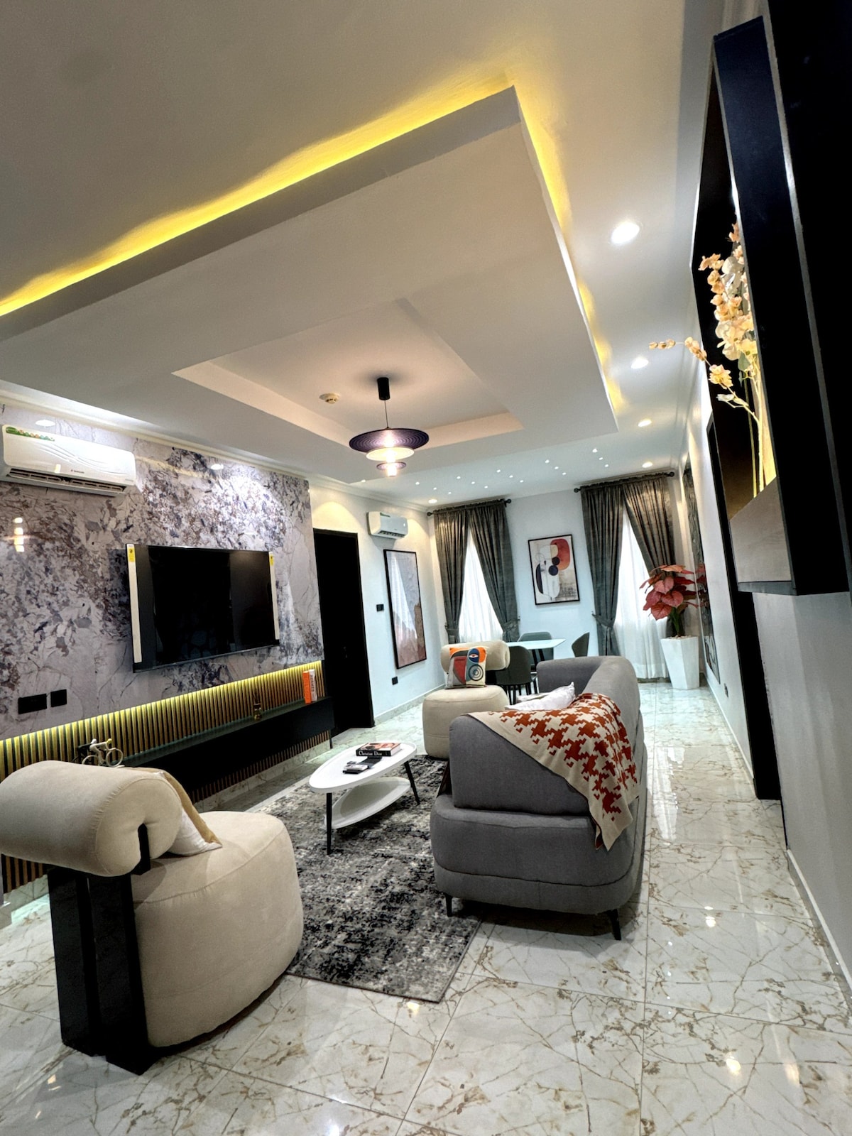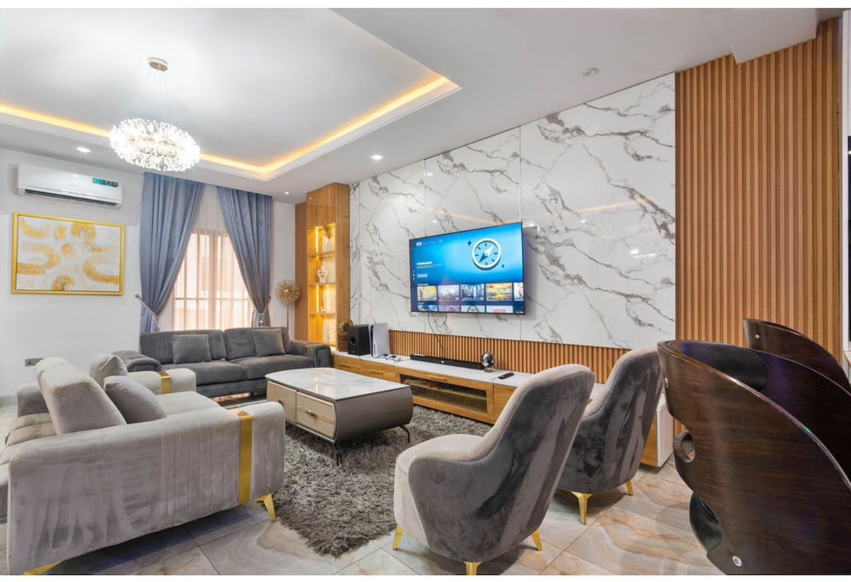 Welcome to TD Luxury Suites, where luxury meets convenience in Lagos. This stylish 4-bedroom apartment offers 24/7 electricity, fast internet, and chic decor for a sophisticated stay. With 24/7 security in a gated estate, you can relax after exploring nearby attractions like movie theaters, shopping malls, restaurants, and bars. The overall decor exudes a trendy and sophisticated style, creating an inviting atmosphere that's perfect for unwinding after a busy day exploring the vibrant city.