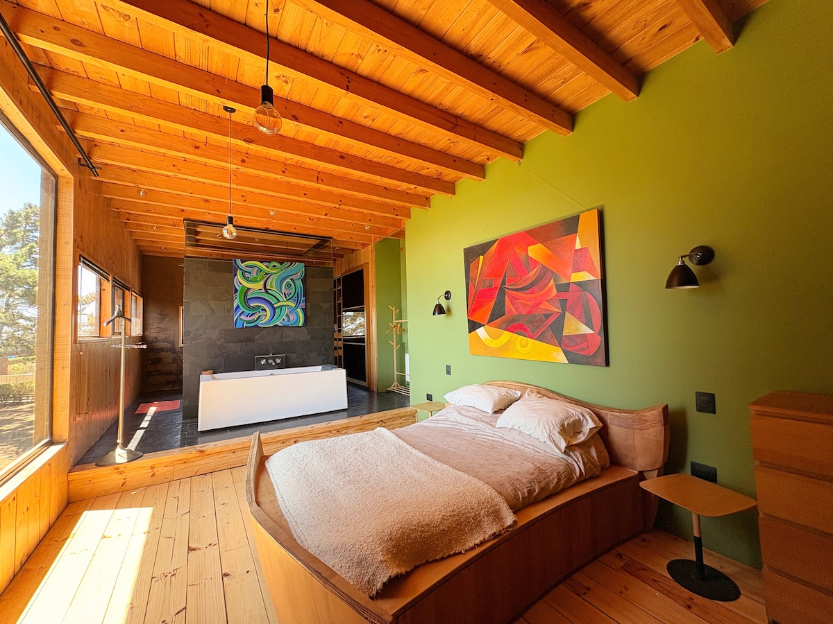 Quédate en una casa con una increíble vista al mar, una propuesta y arquitectura diferentes, todas las comodidades necesarias y una privacidad inigualable. Estarás a minutos de la playa, del río y la desembocadura. Tendrás a tu disposición parrilla, juegos de mesa, cafetera y calefacción electrica. Somos Pet friendly con algunas excepciones. Además, tenemos servicios extra de pago como jacuzzi, telescopio, bienvenida, bicicletas, kayak y SUP. Amplio estacionamiento y camino apto todo vehiculo