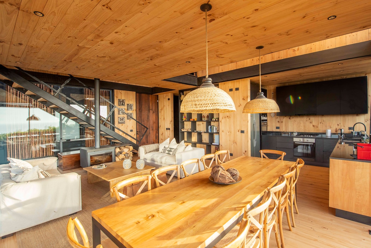 Loft Punta de Lobos is a modern loft 1,000 meters above Punta de Lobos, Chile. It fits 4 guests, expandable to 6 with our flexible rate. Enjoy stunning sea views and a peaceful cypress forest, just 100 meters from Surf Lodge. The loft has a main bedroom with a private bathroom, plus two futon/sofa beds and bunk beds upstairs. Outdoors, find a barbecue area with grill, fire pit, dining table, and mini-bar. Inside, rope straps are available for surfboards.