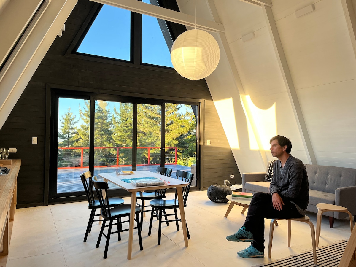 Relajate en este alojamiento único y tranquilo con espetaculares vistas al campo y al mar. La terraza cuenta con un juego de living, dos reposera para tomar sol, y una parrilla a carbon. En el sector cercano al estacionamiento esta el hot tube y un espacio con fogonero, todos con espectaculares vistas. El lugar es ideal para la práctica de deportes acuáticos: Surf, Kite surf, Wind surf, Wind Foil y también para practicar mountain bike y e-bike con increíbles pistas en cerros rodeados de pinos.