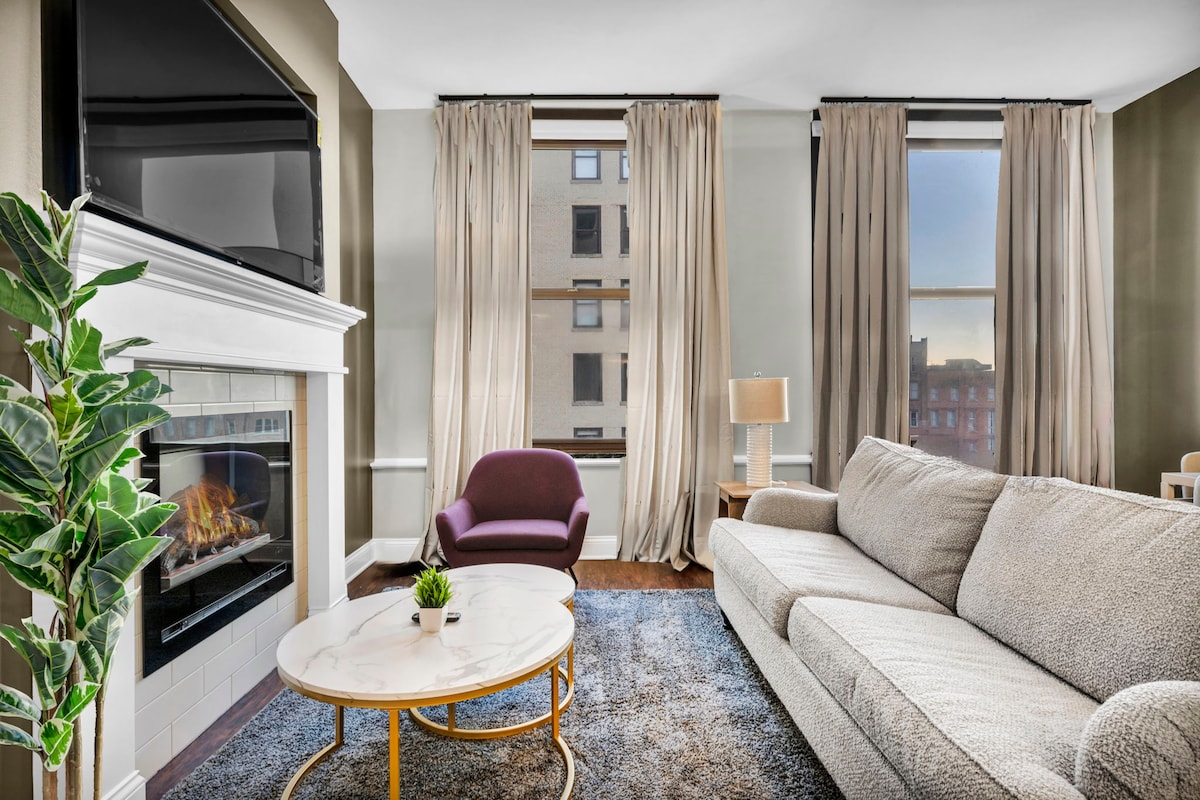 Welcome to your Luxe Cleveland Penthouse Retreat: > Multi-level luxury Penthouse in Stonebridge Flats > 3 spacious bedrooms + flex space > Kohler Effervescent Waterfall Soaking Tub > Private theater room with 108" screen & Massage chair > Treadmill & In-home gym featuring Tonal smart system > Four fireplaces throughout, including on the private patio > Skyline views from the outdoor seating area > Fully equipped chef’s kitchen > High-speed Wi-Fi, smart TVs, in-unit laundry