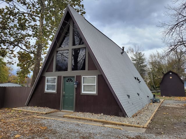 This A Frame is unique in character and has been completely renovated and updated, A perfect setting to lounge on the patio by the campfire or kick up your heels on the suspended deck and watch the sun rise while sipping on your favorite cup of coffee. A great place for your entire family, your group of friends, or just a romantic getaway for two. Situated in the tranquility of nature and completely surrounded by woods and yet-only a few minutes from town. (Mt. Vernon OH.)
