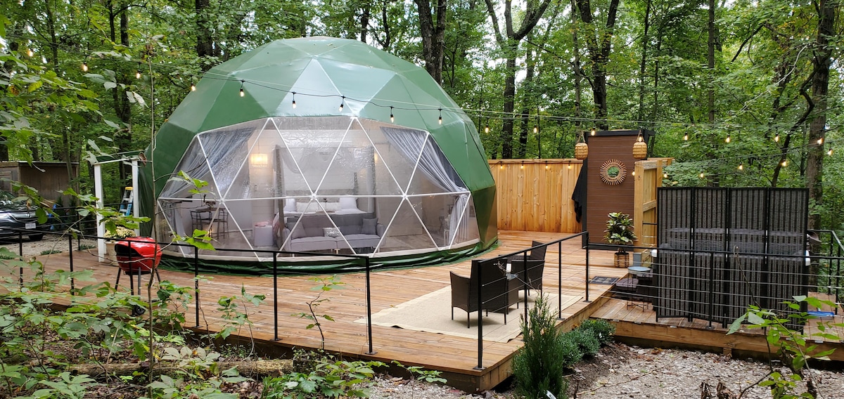 Experience the outdoors in style at this luxury glamping dome, ranked as one of the most “favorited” Illinois listings on Airbnb. Enjoy panoramic forest views through large windows, a plush king bed, full kitchen setup, washer/dryer, and a refreshing shower. Outside, relax in the private hot tub, gather around the fire pit, or cook on the charcoal grill. Perfect for couples or nature lovers seeking a relaxing escape close to wineries, hiking, and all the beauty of Southern Illinois.