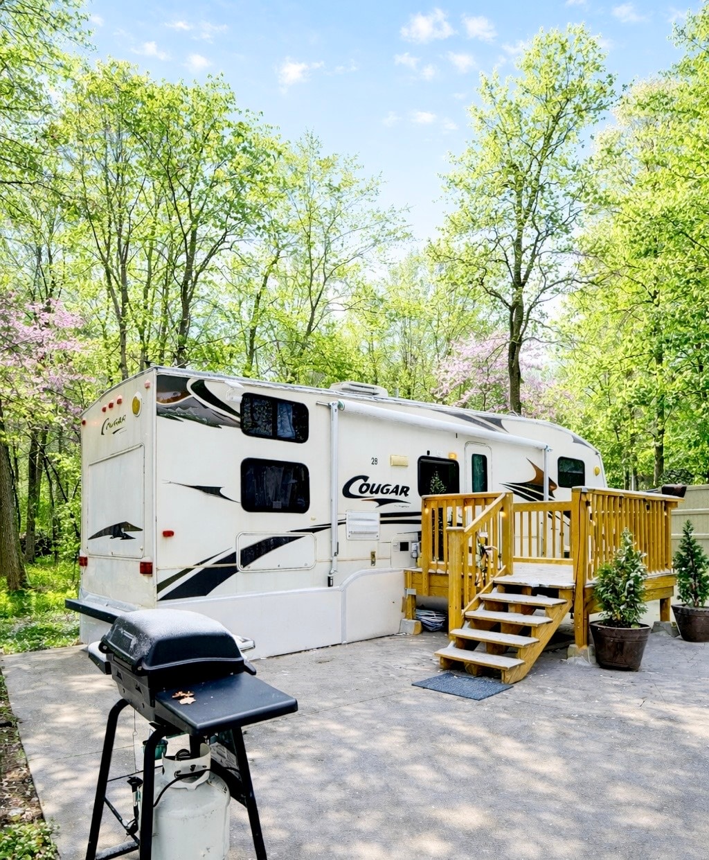 Glamping with real comfort:cozy camper on top of Mad River Mtn,fully connected to on-site utilities. Enjoy reliable heat,hot water,strong Wi-Fi and a fully equipped kitchen. Enjoy coffee on the deck and explore the nature around you. Explore nearby: • Hiking trails and scenic walks • Horseback riding 5 min away • Ohio Caverns • Indian Lake • Charming Bellefontaine You’ll love: • Quiet setting • Two private bedrooms • Gated community Ideal for families or groups of four. Book your stay today!