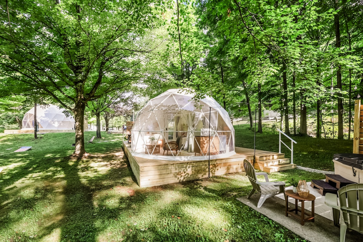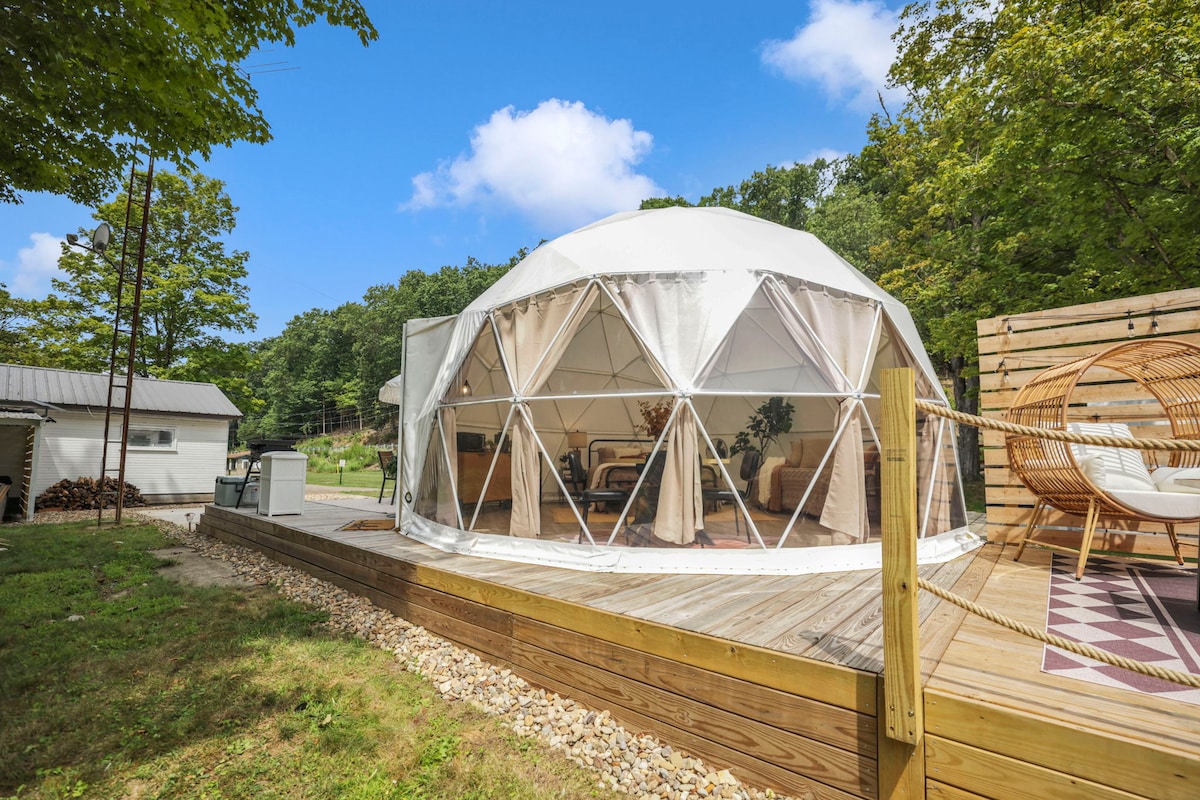 The Stargazer Glamping Dome is the perfect getaway to experience nature with all the luxurious amenities. - Stargazer skylight top - Open year-round—heat & AC - Located on 7 secluded acres - Direct access to the Mohican River - Private hot tub - Fully furnished patio with fire pit - Fully equipped kitchenette - Projector with Roku for streaming - Starlink WIFI - Luxury bathroom - Scenic views of the forest and river - Paved parking area - 1.6 mil.from the Bridge of Dreams/Mohican Valley Trail