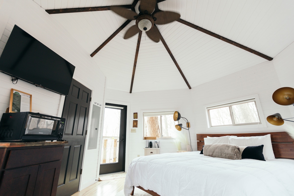 This yurt cabin is your perfect getaway! Tucked away in the woods with 110 acres out your back door, you are invited to unwind and enjoy nature. This space is bathed in natural light, streaming through the big windows and 5 ft ceiling dome. Enjoy the visual rhythm of the ceiling and the unique aesthetic of a round yurt cabin that is unlike anything you've experienced!