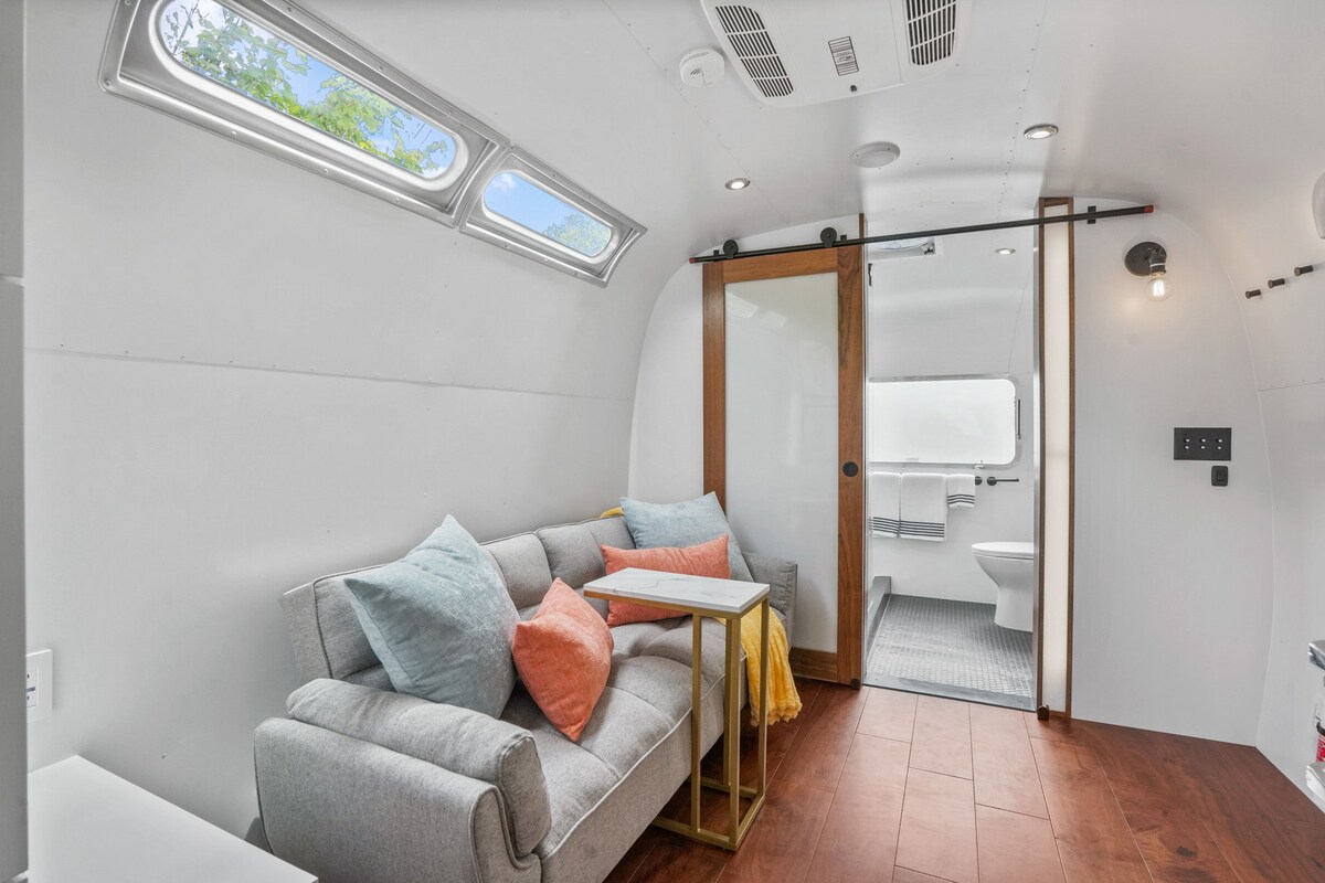The Lux is our largest and most luxurious tiny home. At 32 foot long, it looks striking from a distance. The butterfly roof and accent walls give you a hint of what to expect when you walk in. The Lux has all the basics you’d expect for a luxurious stay: full bathroom with running water (not a composting toilet) a full kitchen, heat/AC, fast wifi & a memory foam queen size bed. But it’s what you wouldn’t expect in a tiny home that will get you.