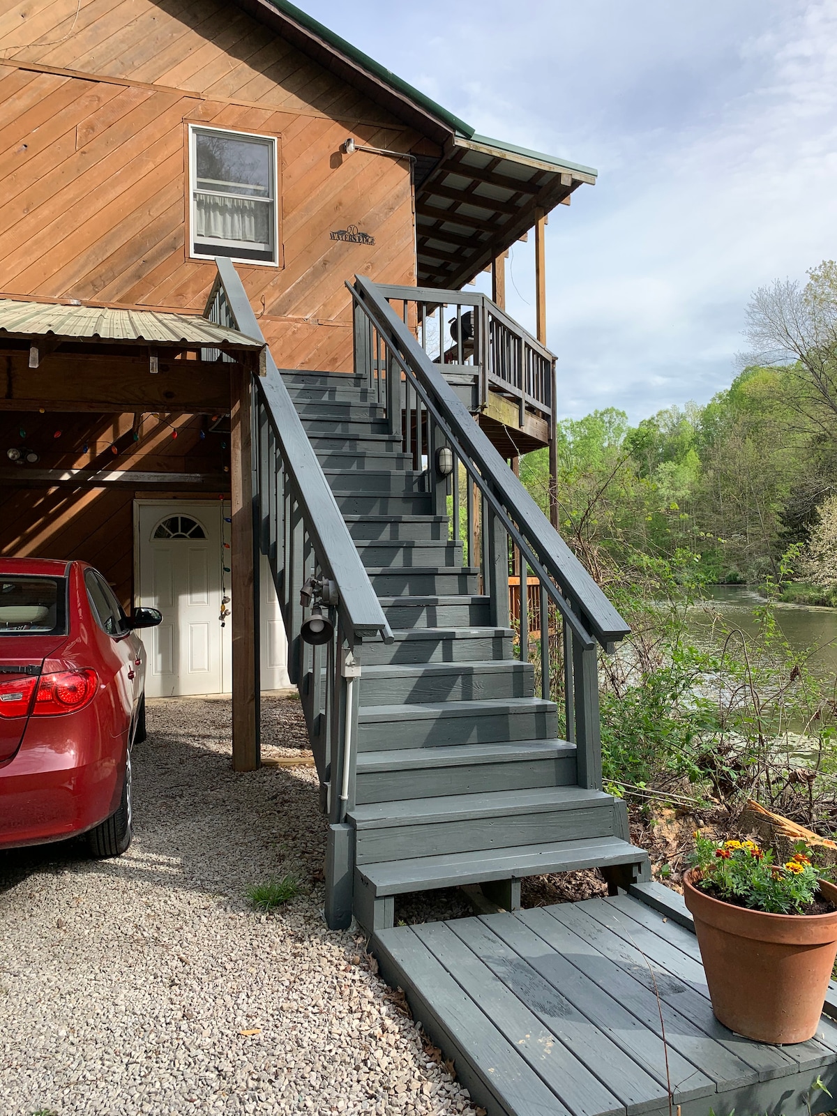 “Winter” at PaPa Cabin be prepared for a different experience. This little house, perched on a cliff, is off the grid, surrounded by forest. A quarter mile walk through the woods leads to the cabin. Bedroom sleeps two on the comfy bed. With only 12 volt (like your car) solar electricity, gas heat, some 12v fans (no AC) it will be an adventure! In the kitchenette, guests will find a propane range top, a fridge, and cooking utensils, bottled water, outside a charcoal grill.