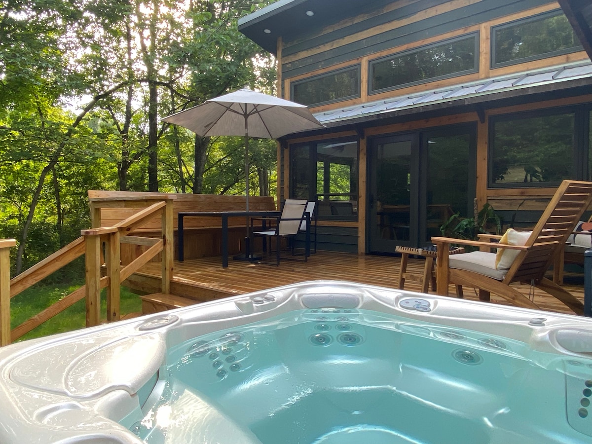 -Ideal for those who enjoy hiking, biking, and hunting. -Only 15 minutes from Ohio University (OU). -Close proximity to Hocking Hills, just 45 minutes away. -Motorcycle-friendly townhouse located within Strouds Run State Park. -Perfect blend of comfort and adventure. -Private outdoor oasis surrounded by nature. -Ample seating for relaxation and socializing. -Soothing hot tub for unwinding after outdoor activities.