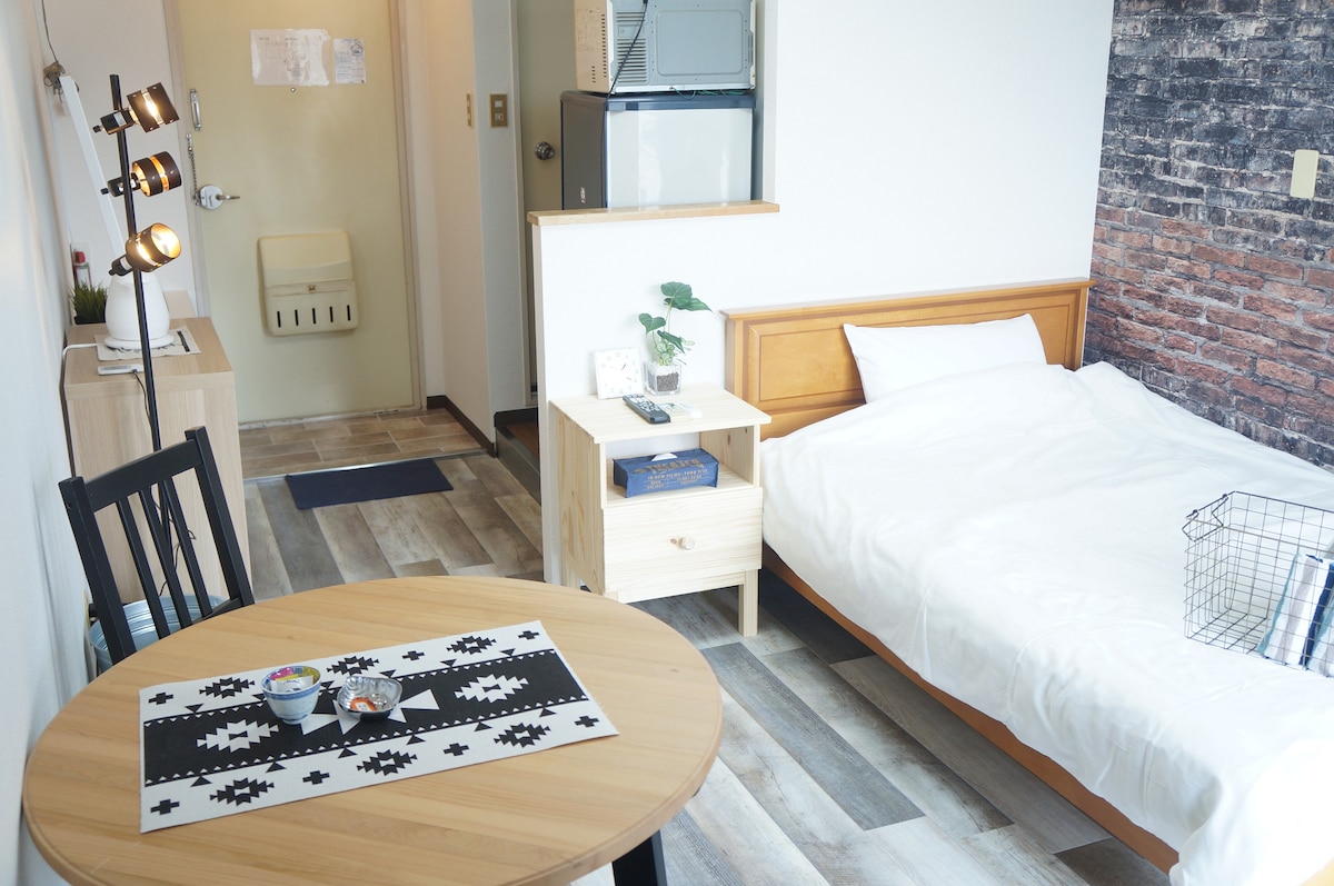 福岡「地下鉄天神駅」から徒歩5分。マンションの一室を改築。ダブルベッド1台にソファベッド1台。