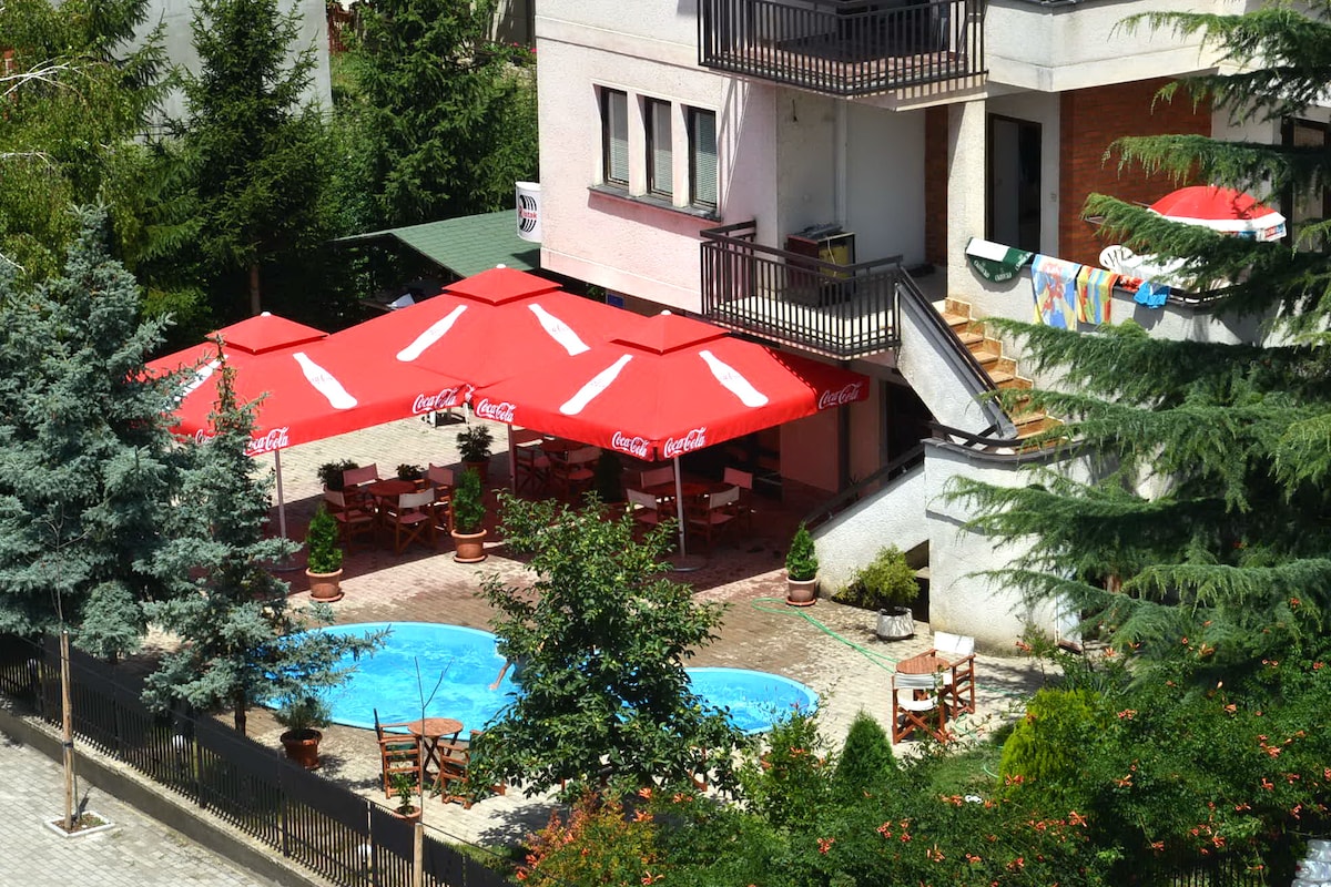 Between the lake and the mountain our villa is located where you can enjoy in the beautiful nature of the National park Galicica and still be close with walking distance to the lake. Stylish Villa with full accommodation 2 bedrooms, bathroom with hot tub, full-equipment kitchen, living and dining area, huge TV, air conditioner, WI FI, lake view balcony, maintained garden with a natural fountain, BBQ area... Free reserved parking.