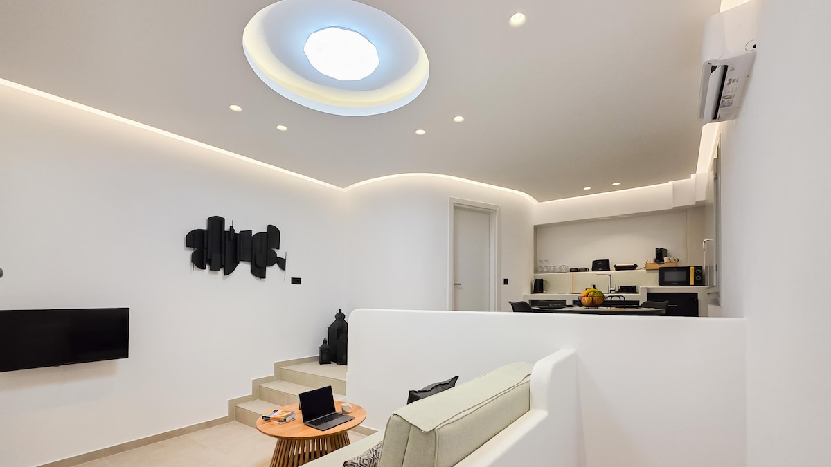 This elegant suite is perched on the cliffs of the caldera in Oia. It combines traditional Cycladic architecture with a minimal decorative style, making it the perfect choice for those who want to relax. The suite features a private outdoor cave hot tub, offering privacy along with stunning views of the caldera and volcano. Breakfast is included in the price. The room is equipped with air conditioning, free Wi-Fi, coffee and tea-making facilities, bath amenities, and a smart TV.