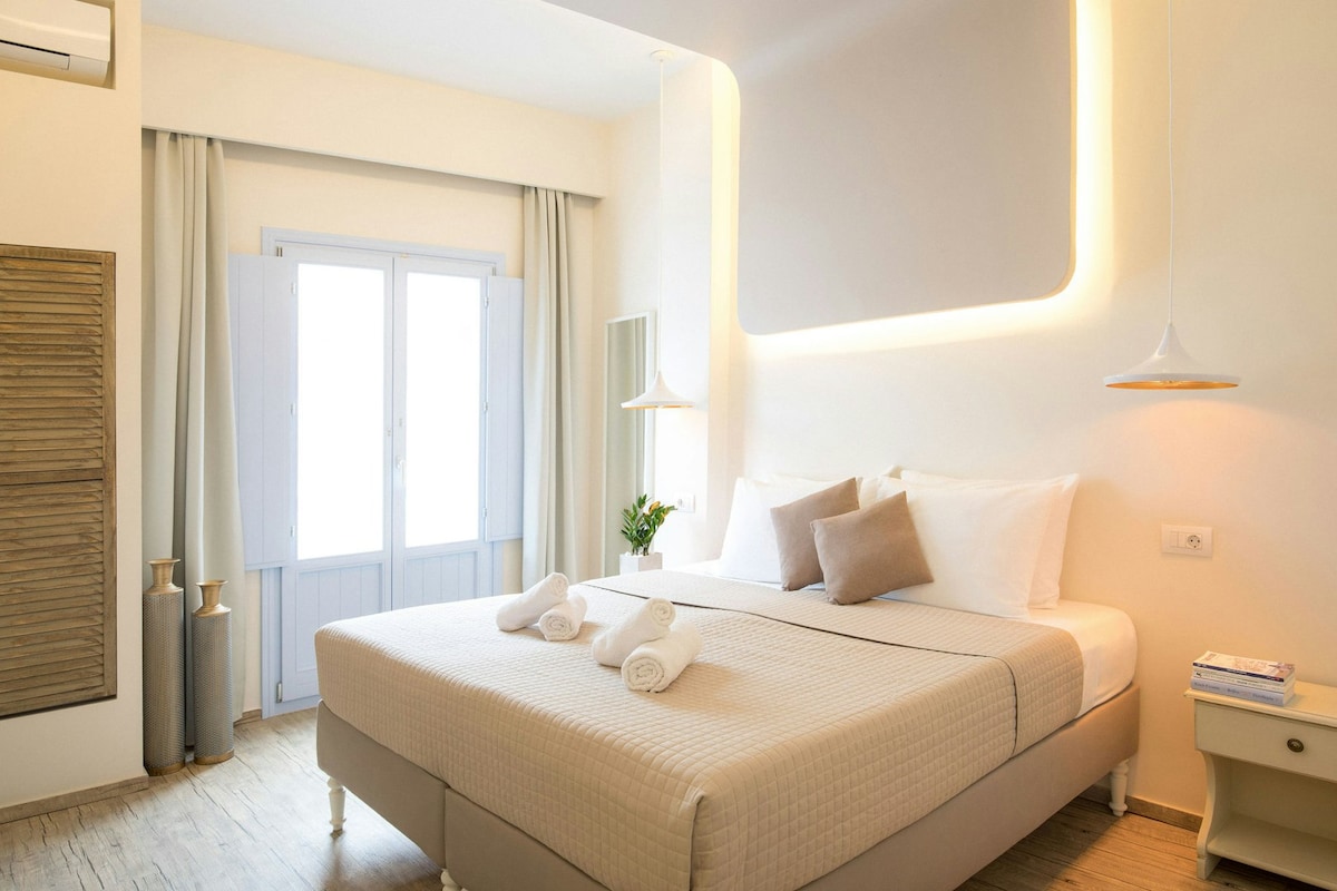 Queen Suite can easily accommodate 1 to 3 persons with one bedroom with double bed, one sofa bed for extra guest, all necessary equipment for making your morning coffee or tea, living room, bathroom with double shower, private furnished balcony and outdoor heated plunge pool with caldera and volcano view.Enjoy easy access to popular shops and restaurants from this charming place to stay.