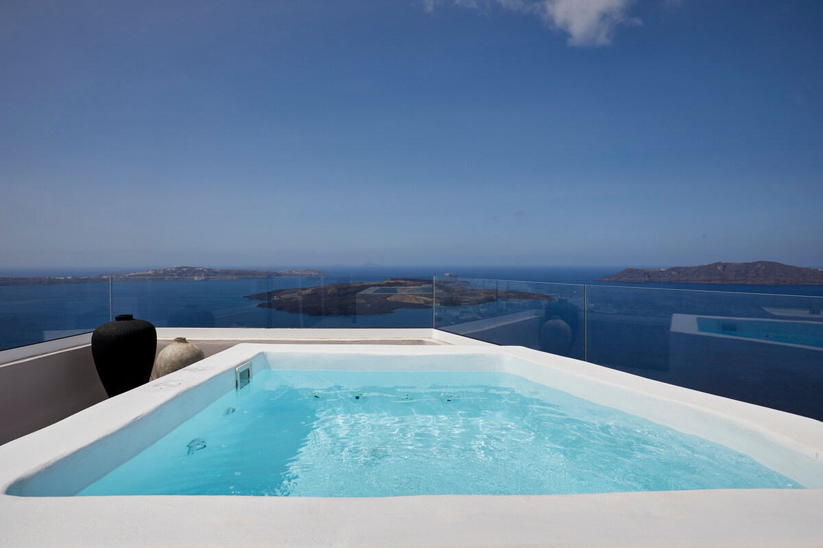 This elegant suite is perched on the cliffs of the caldera in Oia. It combines traditional Cycladic architecture with a minimal decorative style, making it the perfect choice for those who want to relax. The suite is aprox 37 sm, features a private outdoor cave hot tub, offering privacy along with stunning views of the caldera and volcano. Breakfast is included in the price. The room is equipped with air conditioning, free Wi-Fi, coffee and tea-making facilities, bath amenities, and a smart TV.
