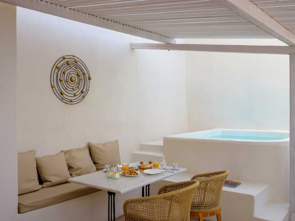 A romantic first level suite,cleaned and heated outdoor private jacuzzi with seaview, traditional interior design, tv,a/c, fridge, wi-fi , microwave, full equipment kitchen, spacious bathroom and free transfer service to and from airport. We help you orginise all of your activities and rentals. We offer free luggage store. We are central located,next to bus stations,Soupermarkets,local restaurants Just 3km away from Thira, 2 km from airport and 3 km away from the beach. Oia is just 12 min away.