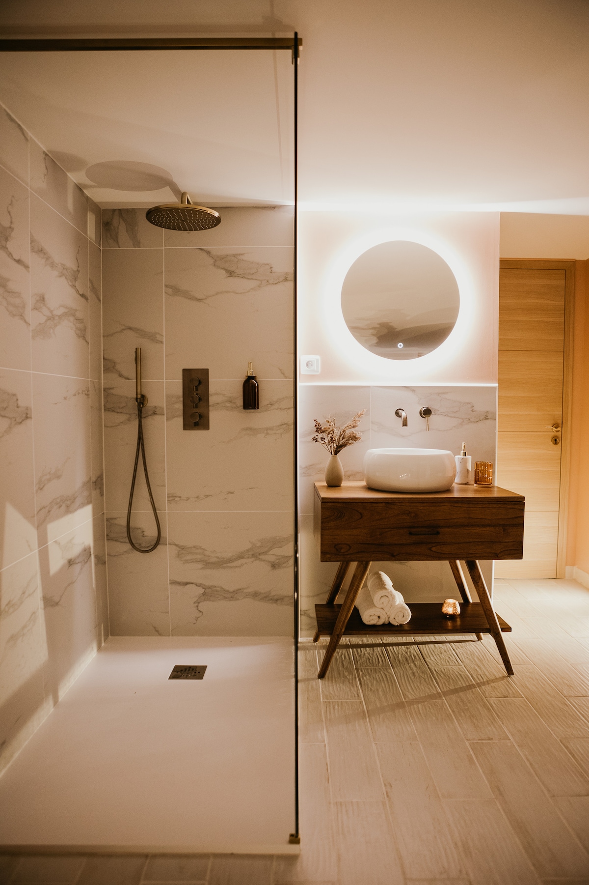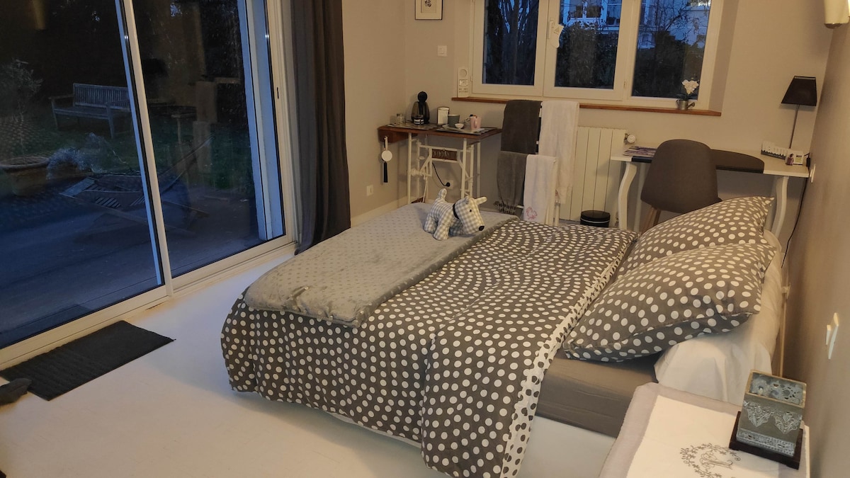 Détendez-vous dans ce logement calme et élégant sur le toit terrasse. Notre chambre d'amis est entièrement indépendante et équipée de sa propre salle d'eau et wc séparé. Un petit salon vous permettra de déguster un café ou un thé dans une ambiance feutrée. Vous dormirez dans un lit avec sommier électrique et matelas en mousse à mémoire de forme. Sur la terrasse vous pourrez plonger lentement dans un spa bien chaud et laisser vos ennuis s'évaporer.