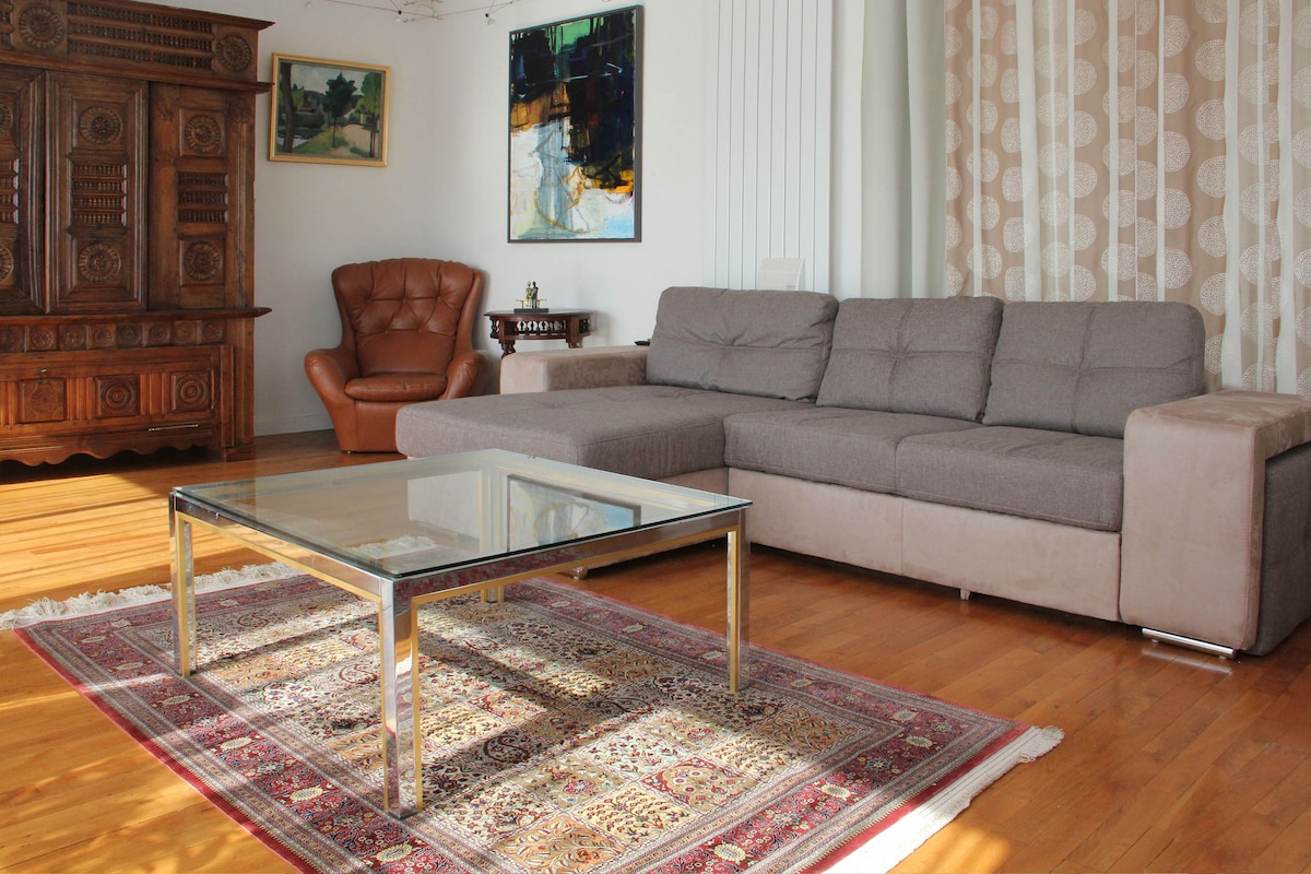Feel like at home ! One room + second room upon request with extra charge for welcoming 4 persons. Situated on the 1st floor of our own house, this large bedroom has view on our garden. Very quiet, equipped with king size bed, tv, wifi, desk, and a great view on our garden and forest this one has got its own private bathroom on the same floor. Breakfast included for two. You may rent a second room at the SAME RATE if needed , on the same floor. Special price for family on request.