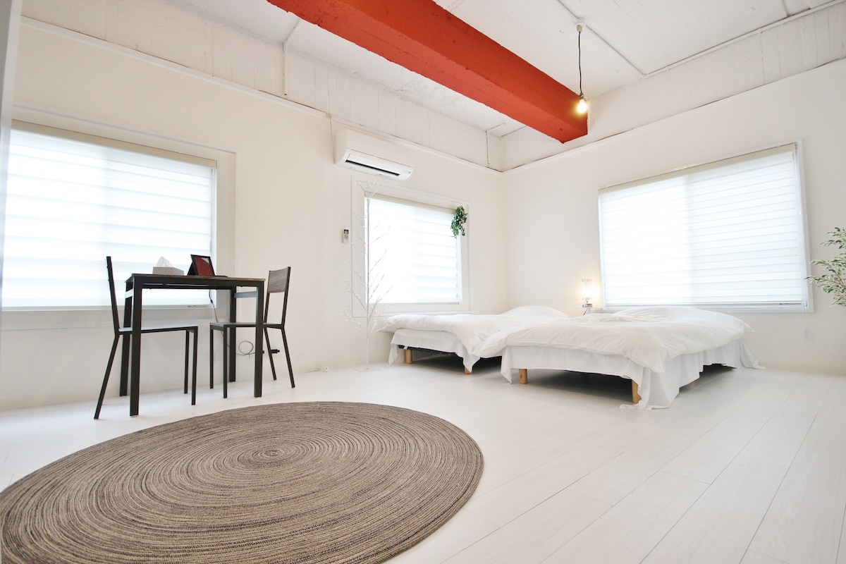 + Only minutes walk from BEPPU STATION and ONSEN!! + Free Parking lot is available + Modern Accommodation + "Brooklyn" Theme + Western bedroom with 1 double bed, 3 single beds + Spacious LIVING ROOM with TV and 1 Sofabed and 1 futon + KITCHEN with safe IH stove and all cooking equipment + Clean & modern BATHROOM with Washlet (Japanese Smart Toilet) + Brand new spacious BATH (and shower) with Washer and Dryer + For groups of 2-7 guests
