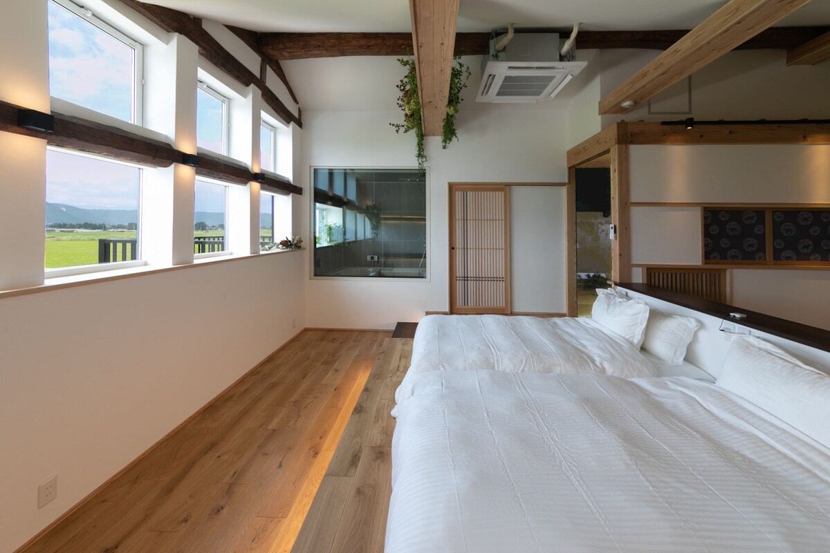 寝室から一望できる阿蘇山の絶景。時を紡ぐ築200年の歴史ある米蔵に、暮らすように泊まる