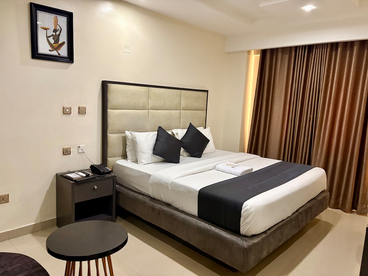 Experience luxury at this stylish Lagos retreat! Featuring a plush king-size bed, chic parlor, smart TV, high-speed Wi-Fi, and air conditioning, this suite blends comfort and sophistication. Nestled in a vibrant, upscale neighborhood near top dining and nightlife, it’s perfect for business or leisure. Enjoy premium amenities, elegant design, and a true 5-star experience in the heart of Lagos.