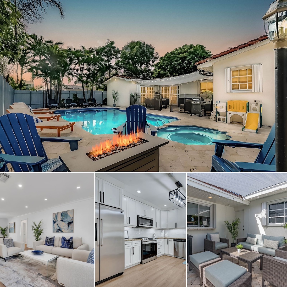 Renovated 4‑bedroom villa near Hallandale Beach with new pool, hot tub and fenced backyard. 3 rooms have queen beds, and the 4th doubles as a cinema/play room with foosball table and sleeper sofa. Covered cabana includes fans, sofa, TV, fireplace, grill, loungers and jacuzzi. Inside: full kitchen, indoor fireplace, workspace, Wi‑Fi and streaming. On‑site parking, laundry and pet‑friendly-extra fee. Close to Aventura Mall, Gulfstream Park, Hard Rock Casino and Hollywood Beach Boardwalk.