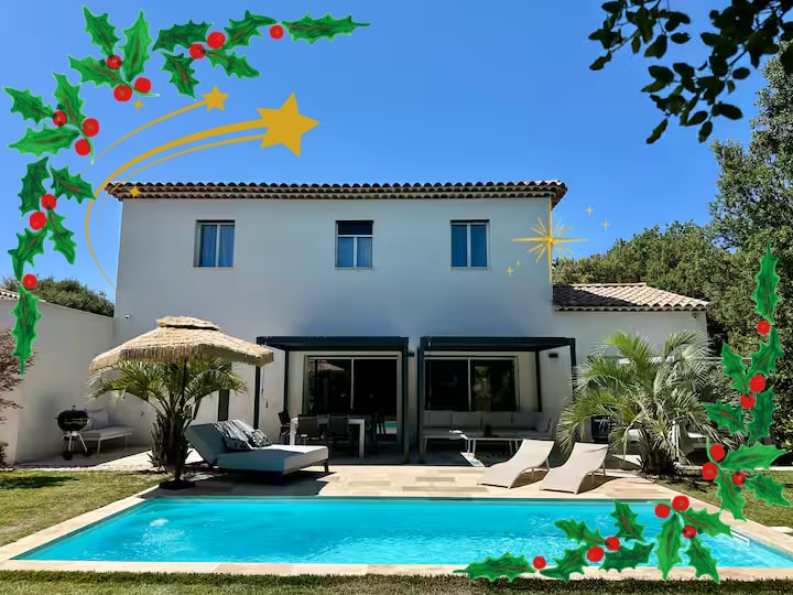 Maison exposée plein Sud de 250 m² et son séjour de 100 m², entièrement rénovée en 2024 dans l'esprit d'un petit mas provençal sur 3000 m² de jardin paysager. Prestations haut de gamme et très bien équipée: -Piscine chauffée (avril à octobre) -2 suites parentales avec lits King size -Climatisation dans toute la maison -Nombreux équipements de loisir (terrain de pétanque, ping ping, table de billard, air hockey...)