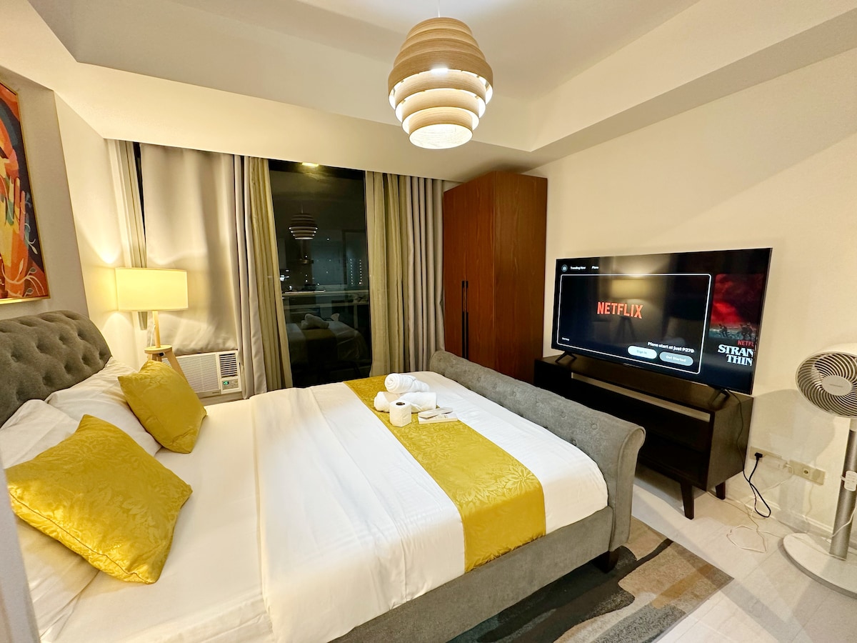The unit is in Birch Tower, Floor 47. View is fantastic. Room is a 24sqm studio type with a balcony above 160 meters from the street. You can use the swimming pool, gym and sauna. Room has a silent split type aircon. 65" curved smart 4k TV with Netflix and other movie apps to ensure you can relax and enjoy watching your favorite movies. Its better than you expect. Security 24/7. The tower is 50 meters from Robinson Place Manila, a huge Shopping Mall. Manila Bay is 10 minutes away by walking.