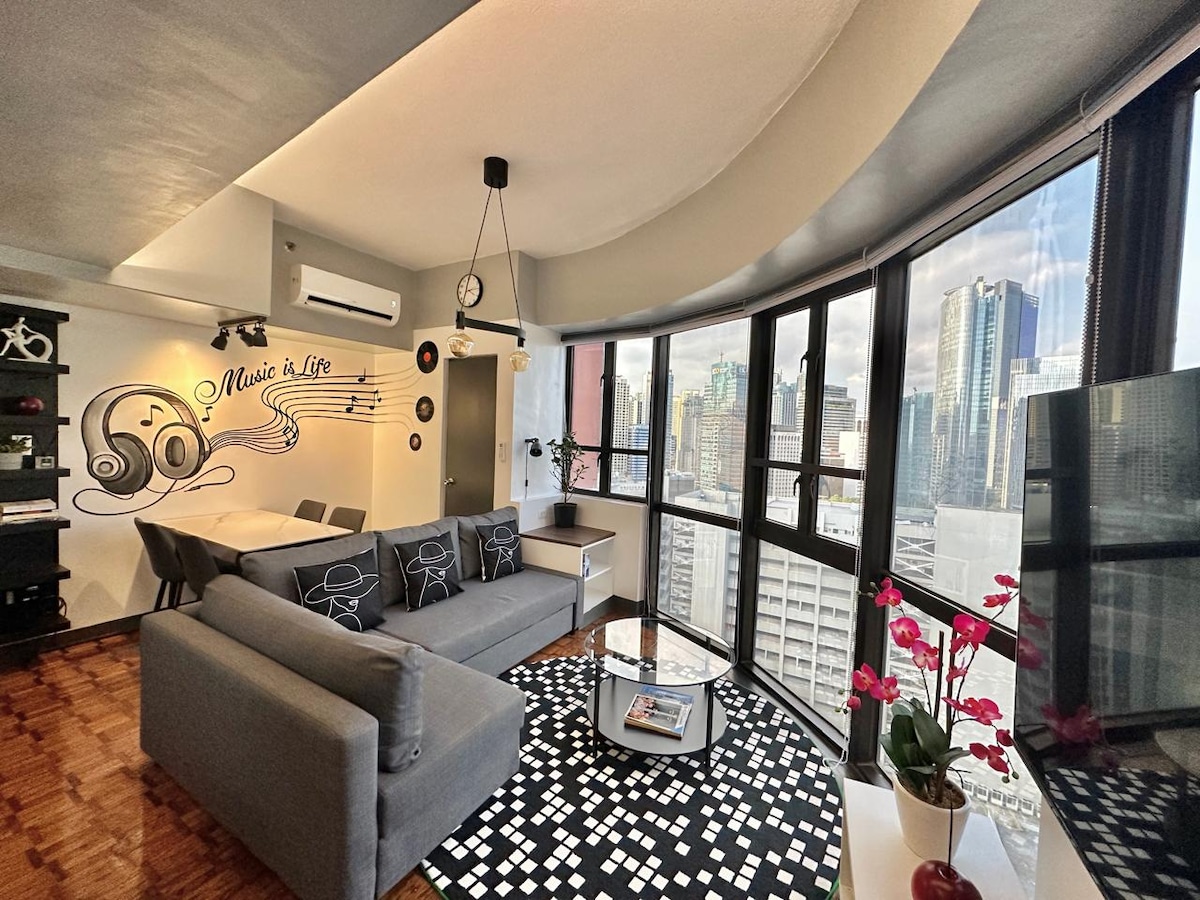 Our theme is Music in this studio apartment, which is cozy yet large enough to have a comfortable King Bed in it, + a sofa bed in case you have a 3rd or even 4th guest stay over. You won't want to leave this Oasis (and it’s views), but if you do - cross the street and you are in Greenbelt, with dozens of restaurants and hundreds of shops, or in Legazpi village with unique places to explore. Find home here for just the little while that we have you.