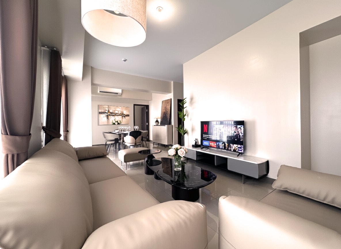 Your Executive retreat (30% off 7+ nights) includes: Ogawa full-body massage chair De'Longhi coffee bar + Marshall speakers Tempur Queen bed · Goose down pillows Crate & Barrel furnishings · 78 SQM Wraparound balcony · Rockwell skyline views Private outdoor dining set above the city Full blackout smart curtains Fully stocked kitchen · Complete toiletries 50" Samsung TV · Netflix · High-speed WiFi All included – Rooftop pool · Gym · Private parking Smart lock self check-in anytime 24/7 security