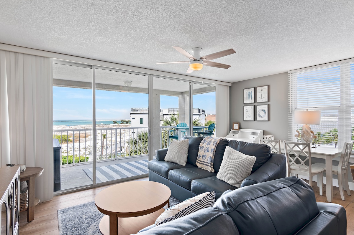 As soon as you enter our 3rd floor beachfront condo, you will leave all your cares behind and unwind while enjoying a direct view of the Gulf of Mexico. You can walk to the beach straight out of the building, no need to cross any roads. Many updates done in March 2021: brand new queen size sleeper sofa bed, brand new stainless steel refrigerator, range, dishwasher and microwave, brand new furniture, new paint, new flooring, and brand new TV's. We have Netflix and high speed WiFi.